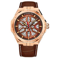 Rose gold-tone alloy case with a brown leather strap. Fixed rose gold-tone alloy bezel. Brown (cut-out) dial with luminous brown dauphine-style hands and index hour markers. Minute markers around the outer rim. Dial Type: Analog. Luminescent hands and markers. Automatic movement. Scratch resistant Krysterna crystal. Pull / push crown. Transparent case back. Round case shape. Case size: 44 mm. Case thickness: 13 mm. Band length: 9 inches. Deployment with push button release clasp. Water resistant at 50 meters / 165 feet. Functions: date, hour, minute, second. Legacy Series. Dress watch style. Watch label: Swiss Made. Stuhrling Original Legacy Automatic Brown Dial Men's Watch M13482. INFORMATION Brand: Stuhrling Original Series: Legacy Collection Name: Legacy Gender: Mens Model: M13482 Watch Label: Swiss Made Movement: Automatic CASE Case Size: 44 mm Case Thickness: 13 mm Case Material: Alloy Case Shape: Round Case Back: Transparent BAND Band Material: Leather Band Type: Strap Band Color: Brown Band Length: 9 inches Clasp: Deployment with Push Button Release DIAL Dial Color: Brown (Cut-Out) Type: Analog Crystal: Scratch Resistant Krysterna Hands: Luminous Brown Dauphine-style Dial Markers: Index Second Markers: Minute Markers around the outer rim Luminiscence: Hands and Markers Bezel: Fixed Bezel Color: Rose Gold-tone Bezel Material: Alloy Crown: Pull / Push FEATURES Water Resistance: 50 meters / 165 feet Functions: Date, Hour, Minute, Second Watch Features: Leather, Gold, Analog ADDITIONAL INFO Watch Style: Dress Warranty: With Manufacturers Guarantee UPC Code: 190638109579 Jomashop Sku: ST-OM13482 Department: Watches Category: Watches