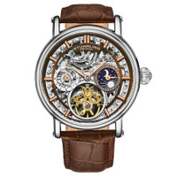 Silver-tone alloy case with a brown leather strap. Fixed silver-tone alloy bezel. Brown skeleton dial with rose gold-tone leaf-style hands and index hour markers. Dial Type: Analog. Two displays showing: am/pm indicator and 12 hours (dual time). Automatic movement. Scratch resistant mineral crystal. Pull / push crown. Transparent case back. Round case shape. Case size: 43 mm. Case thickness: 12 mm. Band length: 9 inches. Tang clasp. Water resistant at 30 meters / 100 feet. Functions: hour, minute, am/pm indicator, dual time. Legacy Series. Dress watch style. Stuhrling Original Legacy Automatic Brown Dial Men's Watch M13583. INFORMATION Brand: Stuhrling Original Series: Legacy Collection Name: Legacy Gender: Mens Model: M13583 Movement: Automatic CASE Case Size: 43 mm Case Thickness: 12 mm Case Material: Alloy Case Shape: Round Case Back: Transparent BAND Band Material: Leather Band Type: Strap Band Color: Brown Band Length: 9 inches Clasp: Tang DIAL Dial Color: Brown Skeleton Type: Analog Crystal: Scratch Resistant Mineral Hands: Rose Gold-tone Leaf-style Dial Markers: Index Sub Dials: Two - AM/PM Indicator and Dual Time Bezel: Fixed Bezel Color: Silver-tone Bezel Material: Alloy Crown: Pull / Push FEATURES Water Resistance: 30 meters / 100 feet Functions: Hour, Minute, AM/PM Indicator, Dual Time Watch Features: Leather, Gold, Analog ADDITIONAL INFO Watch Style: Dress Warranty: With Manufacturers Guarantee UPC Code: 190638110582 Jomashop Sku: ST-OM13583 Department: Watches Category: Watches