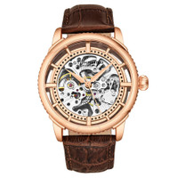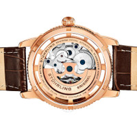 Rose gold-tone alloy case with a brown leather strap. Fixed rose gold-tone alloy bezel. Rose (skeleton) dial with rose gold-tone hands and index hour markers. Minute markers. Dial Type: Analog. Automatic movement. Scratch resistant mineral crystal. Pull / push crown. Skeleton case back. Round case shape. Case size: 41 mm. Case thickness: 12 mm. Band width: 20 mm. Band length: 9.25 inches. Tang clasp. Water resistant at 100 meters / 330 feet. Functions: hour, minute, second. Legacy Series. Dress watch style. Stuhrling Original Legacy Automatic Rose Dial Men's Watch M13633. INFORMATION Brand: Stuhrling Original Series: Legacy Collection Name: Legacy Gender: Mens Model: M13633 Movement: Automatic CASE Case Size: 41 mm Case Thickness: 12 mm Case Material: Alloy Case Shape: Round Case Back: Skeleton BAND Band Material: Leather Band Type: Strap Band Color: Brown Band Length: 9.25 inches Band Width: 20 mm Clasp: Tang DIAL Dial Color: Rose (Skeleton) Type: Analog Crystal: Scratch Resistant Mineral Hands: Rose Gold-tone Dial Markers: Index Second Markers: Minute Markers Bezel: Fixed Bezel Color: Rose Gold-tone Bezel Material: Alloy Crown: Pull / Push FEATURES Water Resistance: 100 meters / 330 feet Functions: Hour, Minute, Second Watch Features: Leather, Gold, Analog ADDITIONAL INFO Watch Style: Dress Warranty: With Manufacturers Guarantee UPC Code: 190638111084 Jomashop Sku: ST-OM13633 Department: Watches Category: Watches