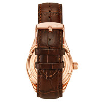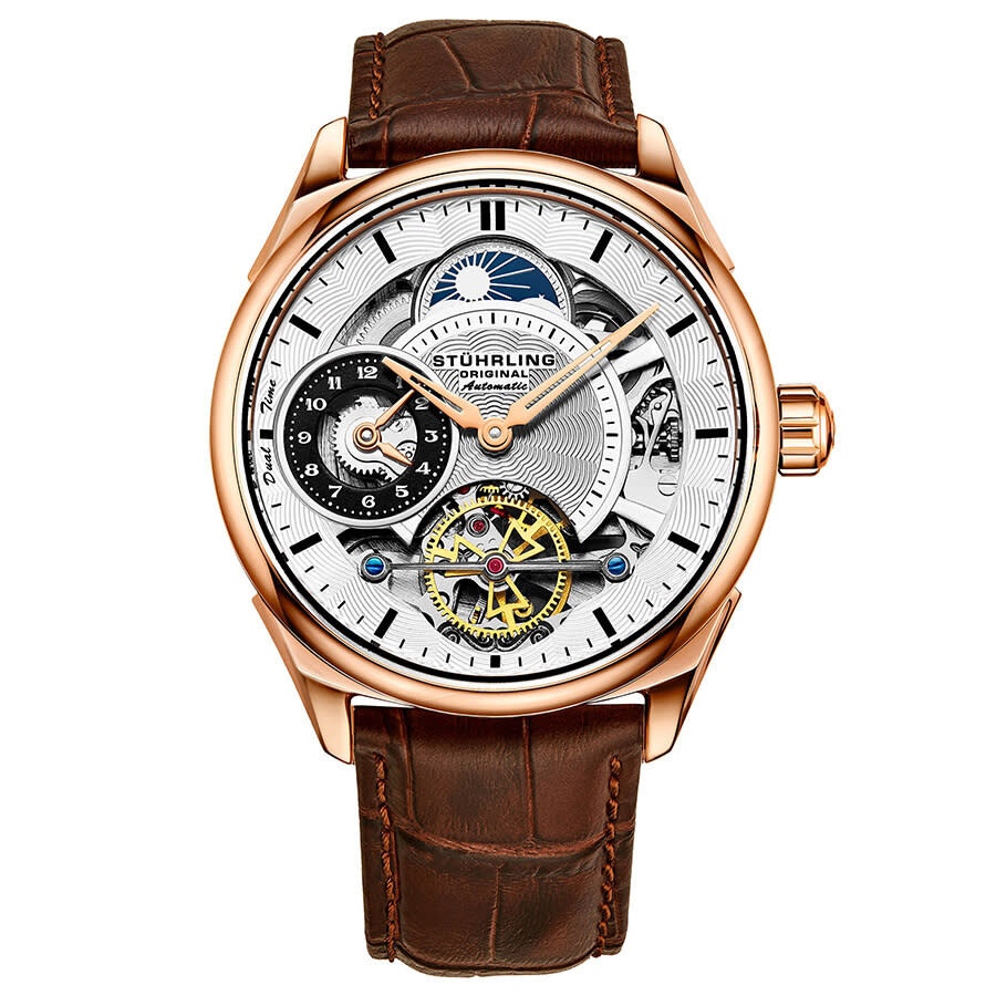 Rose gold-tone stainless steel case with a brown leather strap. Fixed rose gold-tone bezel. Silver (skeletal window) dial with rose gold-tone alpha-style hands and index hour markers. Minute markers around the outer rim. Dial Type: Analog. Two displays showing: am/pm indicator and 12 hour (dual time). Automatic movement. Scratch resistant mineral crystal. Pull / push crown. Transparent case back. Round case shape. Case size: 42 mm. Case thickness: 12.5 mm. Band length: 7.5 inches. Tang clasp. Water resistant at 50 meters / 165 feet. Functions: hour, minute, am/pm indicator , dual time. Dress watch style. Stuhrling Original Legacy Automatic Silver Dial Men's Watch M13509. INFORMATION Brand: Stuhrling Original Series: Legacy Collection Name: Legacy Gender: Mens Model: M13509 Movement: Automatic CASE Case Size: 42 mm Case Thickness: 12.5 mm Case Material: Stainless Steel Case Shape: Round Case Back: Transparent BAND Band Material: Leather Band Type: Strap Band Color: Brown Band Length: 7.5 inches Clasp: Tang DIAL Dial Color: Silver (Skeletal Window) Type: Analog Crystal: Scratch Resistant Mineral Hands: Rose Gold-tone Alpha-style Dial Markers: Index Second Markers: Minute Markers around the outer rim Sub Dials: Two - AM/PM Indicator and 24 Hour (Dual Time) Bezel: Fixed Bezel Color: Rose Gold-tone Bezel Material: Stainless Steel Crown: Pull / Push FEATURES Water Resistance: 50 meters / 165 feet Functions: Hour, Minute, AM/PM Indicator , Dual Time Watch Features: Stainless Steel, Leather, Gold, Analog ADDITIONAL INFO Watch Style: Dress Warranty: With Manufacturers Guarantee UPC Code: 190638109845 Jomashop Sku: ST-OM13509 Department: Watches Category: Watches