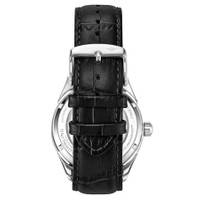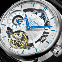 Stainless steel case with a blue leather strap. Fixed stainless steel bezel. Silver (cut-out) dial with blue alpha-style skeleton hands and index hour markers. Minute markers around the outer rim. Dial Type: Analog. Two sub-dials displaying: am/pm indicator and 12 hour (dual time). Automatic movement. Scratch resistant mineral crystal. Pull / push crown. Transparent case back. Round case shape. Case size: 42 mm. Case thickness: 12.5 mm. Band width: 20 mm. Band length: 7.5 inches. Tang clasp. Water resistant at 50 meters / 165 feet. Functions: hour, minute, am/pm indicator , dual time. Legacy Series. Dress watch style. Stuhrling Original Legacy Automatic Silver Dial Men's Watch M13525. INFORMATION Brand: Stuhrling Original Series: Legacy Collection Name: Legacy Gender: Mens Model: M13525 Movement: Automatic CASE Case Size: 42 mm Case Thickness: 12.5 mm Case Material: Stainless Steel Case Shape: Round Case Back: Transparent BAND Band Material: Leather Band Type: Strap Band Color: Blue Band Length: 7.5 inches Band Width: 20 mm Clasp: Tang DIAL Dial Color: Silver (Cut-Out) Type: Analog Crystal: Scratch Resistant Mineral Hands: Blue Alpha-style Skeleton Dial Markers: Index Second Markers: Minute Markers around the outer rim Sub Dials: Two - AM/PM Indicator and 12 Hour (Dual Time) Bezel: Fixed Bezel Color: Silver-tone Bezel Material: Stainless Steel Crown: Pull / Push FEATURES Water Resistance: 50 meters / 165 feet Functions: Hour, Minute, AM/PM Indicator , Dual Time Watch Features: Stainless Steel, Leather, Analog ADDITIONAL INFO Watch Style: Dress Warranty: With Manufacturers Guarantee UPC Code: 190638110001 Jomashop Sku: ST-OM13525 Department: Watches Category: Watches