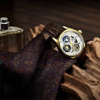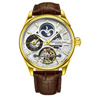 Gold-tone alloy case with a brown leather strap. Fixed gold-tone alloy bezel. Silver (open heart) dial with luminous gold-tone dauphine-style hands and index hour markers. Minute markers around the outer rim. Dial Type: Analog. Luminescent hands and markers. Two sub-dials displaying: am/pm indicator and 24 hour. Automatic movement. Scratch resistant mineral crystal. Pull / push crown. Transparent case back. Round case shape. Case size: 42.5 mm. Case thickness: 13.25 mm. Band width: 20 mm. Band length: 8.5 inches. Tang clasp. Water resistant at 50 meters / 165 feet. Functions: hour, minute, am/pm indicator, 24 hour. Legacy Series. Dress watch style. Stuhrling Original Legacy Automatic Silver Dial Men's Watch M13589. INFORMATION Brand: Stuhrling Original Series: Legacy Collection Name: Legacy Gender: Mens Model: M13589 Movement: Automatic CASE Case Size: 42.5 mm Case Thickness: 13.25 mm Case Material: Alloy Case Shape: Round Case Back: Transparent BAND Band Material: Leather Band Type: Strap Band Color: Brown Band Length: 8.5 inches Band Width: 20 mm Clasp: Tang DIAL Dial Color: Silver (Open Heart) Type: Analog Crystal: Scratch Resistant Mineral Hands: Luminous Gold-tone Dauphine-style Dial Markers: Index Second Markers: Minute Markers around the outer rim Sub Dials: Two - AM/PM Indicator and 24 Hour Luminiscence: Hands and Markers Bezel: Fixed Bezel Color: Gold-tone Bezel Material: Alloy Crown: Pull / Push FEATURES Water Resistance: 50 meters / 165 feet Functions: Hour, Minute, AM/PM Indicator, 24 Hour Watch Features: Leather, Gold, Analog ADDITIONAL INFO Watch Style: Dress Warranty: With Manufacturers Guarantee UPC Code: 190638110643 Jomashop Sku: ST-OM13589 Department: Watches Category: Watches