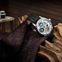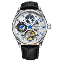 Silver-tone alloy case with a black leather strap. Fixed silver-tone alloy bezel. Silver (open heart) dial with luminous blue dauphine-style hands and index hour markers. Minute markers around the outer rim. Dial Type: Analog. Luminescent hands and markers. Two sub-dials displaying: am/pm indicator and 24 hours. Automatic movement. Scratch resistant mineral crystal. Pull / push crown. Transparent case back. Round case shape. Case size: 42.5 mm. Case thickness: 13.25 mm. Band width: 20 mm, band length: 8.5 inches. Tang clasp. Water resistant at 50 meters / 165 feet. Functions: hour, minute, am/pm indicator, 24 hour. Legacy Series. Dress watch style. Stuhrling Original Legacy Automatic Silver Dial Men's Watch M13598. INFORMATION Brand: Stuhrling Original Series: Legacy Collection Name: Legacy Gender: Mens Model: M13598 Movement: Automatic CASE Case Size: 42.5 mm Case Thickness: 13.25 mm Case Material: Alloy Case Shape: Round Case Back: Transparent BAND Band Material: Leather Band Type: Strap Band Color: Black Band Length: 8.5 inches Band Width: 20 mm Clasp: Tang DIAL Dial Color: Silver (Open Heart) Type: Analog Crystal: Scratch Resistant Mineral Hands: Luminous Blue Dauphine-style Dial Markers: Index Second Markers: Minute Markers around the outer rim Sub Dials: Two - AM/PM Indicator and 24 Hour Luminiscence: Hands and Markers Bezel: Fixed Bezel Color: Silver-tone Bezel Material: Alloy Crown: Pull / Push FEATURES Water Resistance: 50 meters / 165 feet Functions: Hour, Minute, AM/PM Indicator, 24 Hour Watch Features: Leather, Analog ADDITIONAL INFO Watch Style: Dress Warranty: With Manufacturers Guarantee UPC Code: 190638110735 Jomashop Sku: ST-OM13598 Department: Watches Category: Watches