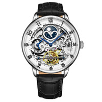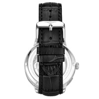 Silver-tone alloy case with a black leather strap. Fixed silver-tone alloy bezel. Silver (skeleton center) dial with blue leaf-style hands and Arabic numeral hour markers. Minute markers around an inner ring. Dial Type: Analog. Two sub-dials displaying: am/pm indicator and 24 hour (dual time). Automatic movement. Scratch resistant mineral crystal. Pull / push crown. Transparent case back. Round case shape. Case size: 40 mm. Case thickness: 12.5 mm. Band width: 22 mm. Band length: 8.25 inches. Tang clasp. Water resistant at 50 meters / 165 feet. Functions: hour, minute, am/pm indicator, dual time. Legacy Series. Dress watch style. Stuhrling Original Legacy Automatic Silver Dial Men's Watch M13600. INFORMATION Brand: Stuhrling Original Series: Legacy Collection Name: Legacy Gender: Mens Model: M13600 Movement: Automatic CASE Case Size: 40 mm Case Thickness: 12.5 mm Case Material: Alloy Case Shape: Round Case Back: Transparent BAND Band Material: Leather Band Type: Strap Band Color: Black Band Length: 8.25 inches Band Width: 22 mm Clasp: Tang DIAL Dial Color: Silver (Skeleton Center) Type: Analog Crystal: Scratch Resistant Mineral Hands: Blue Leaf-style Dial Markers: Arabic Numeral Second Markers: Minute Markers around an inner ring Sub Dials: Two - AM/PM Indicator and 24 Hour (Dual Time) Bezel: Fixed Bezel Color: Silver-tone Bezel Material: Alloy Crown: Pull / Push FEATURES Water Resistance: 50 meters / 165 feet Functions: Hour, Minute, AM/PM Indicator, Dual Time Watch Features: Leather, Analog ADDITIONAL INFO Watch Style: Dress Warranty: With Manufacturers Guarantee UPC Code: 190638110759 Jomashop Sku: ST-OM13600 Department: Watches Category: Watches