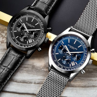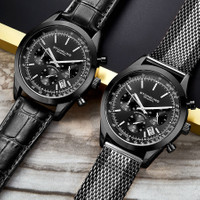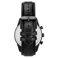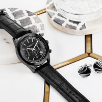 Black alloy case with a black leather strap. Fixed black alloy bezel. Black dial with silver-tone stick-shaped hands and index hour markers. Minute markers. Tachymeter markers around the outer rim. Dial Type: Analog. Luminescent hands and markers. Date display between the 4 and 5 o'clock positions. Chronograph - three sub-dials displaying: 60 second, 30 minute and 24 hour. Quartz movement. Scratch resistant mineral crystal. Pull / push crown. Solid case back. Round case shape. Case size: 44 mm. Case thickness: 10.5 mm. Band width: 20 mm. Band length: 8.5 inches. Tang clasp. Water resistant at 100 meters / 330 feet. Functions: date, hour, minute, second, 24 hour, tachymeter. Monaco Series. Sport watch style. Stuhrling Original Monaco Quartz Black Dial Men's Watch M13651. GENERAL Box Type: Original Box CASE Case Size: 44 Case Thickness: 10.5 mm Case Material: Alloy Case Shape: Round Case Back: Solid BAND Band Material: Leather Band Type: Strap Band Color: Black Band Length: 8.5 inches Band Width: 20 mm Clasp: Tang DIAL Dial Color: Black Type: Analog Crystal: Scratch Resistant Mineral Hands: Silver-tone Stick-shaped Dial Markers: Index Second Markers: Minute Markers. Tachymeter Markers around the outer rim Sub Dials: Three - 60 Second, 30 Minute and 24 Hour Luminiscence: Hands and Markers Bezel: Fixed Bezel Color: Black Bezel Material: Alloy Crown: Pull / Push INFORMATION Brand: Stuhrling Original Series: Monaco Collection Name: Monaco Gender: Mens Model: M13651 Movement: Quartz FEATURES Water Resistance: 100 meters / 330 feet Calendar: Date display between the 4 and 5 o'clock positions Functions: Date, Hour, Minute, Second, 24 Hour, Tachymeter Watch Features: Analog, Leather, Chronograph ADDITIONAL INFO Watch Style: Sport Warranty: With Manufacturers Guarantee UPC Code: 190638111268 Jomashop Sku: ST-OM13651 Department: Watches Category: Watches