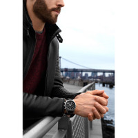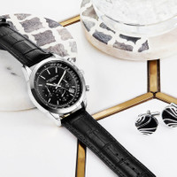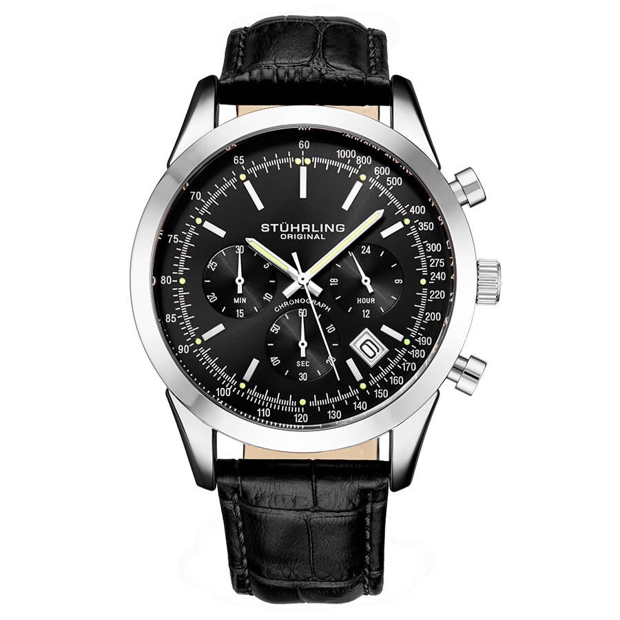 Silver-tone alloy case with a black leather strap. Fixed silver-tone alloy bezel. Black dial with luminous silver-tone stick-shaped hands and index hour markers. Minute markers. Tachymeter markers around the outer rim. Dial Type: Analog. Luminescent hands and markers. Date display between the 4 and 5 o'clock positions. Chronograph - three sub-dials displaying: 60 second, 30 minute and 24 hour. Quartz movement. Scratch resistant mineral crystal. Pull / push crown. Solid case back. Round case shape. Case size: 44 mm. Case thickness: 10.5 mm. Band width: 20 mm. Cand length: 8.5 inches. Tang clasp. Water resistant at 100 meters / 330 feet. Functions: date, hour, minute, second, 24 hour, tachymeter. Monaco Series. Sport watch style. Stuhrling Original Monaco Quartz Black Dial Men's Watch M13659. INFORMATION Brand: Stuhrling Original Series: Monaco Collection Name: Monaco Gender: Mens Model: M13659 Movement: Quartz CASE Case Size: 44 mm Case Thickness: 10.5 mm Case Material: Alloy Case Shape: Round Case Back: Solid BAND Band Material: Leather Band Type: Strap Band Color: Black Band Length: 8.5 inches Band Width: 20 mm Clasp: Tang DIAL Dial Color: Black Type: Analog Crystal: Scratch Resistant Mineral Hands: Luminous Silver-tone Stick-shaped Dial Markers: Index Second Markers: Minute Markers. Tachymeter Markers around the outer rim Sub Dials: Three - 60 Second, 30 Minute and 24 Hour Luminiscence: Hands and Markers Bezel: Fixed Bezel Color: Silver-tone Bezel Material: Alloy Crown: Pull / Push FEATURES Water Resistance: 100 meters / 330 feet Calendar: Date display between the 4 and 5 o'clock positions Functions: Date, Hour, Minute, Second, 24 Hour, Tachymeter Watch Features: Chronograph, Leather, Analog ADDITIONAL INFO Watch Style: Sport Warranty: With Manufacturers Guarantee UPC Code: 190638111343 Jomashop Sku: ST-OM13659 Department: Watches Category: Watches