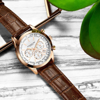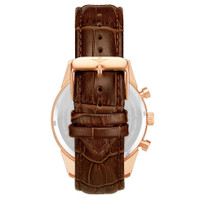 Rose gold-tone alloy case with a brown leather strap. Fixed rose gold-tone alloy bezel. Silver dial with rose gold-tone stick-shaped hands and index hour markers. Minute markers. Tachymeter markings around the outer rim. Dial Type: Analog. Luminescent hands and markers. Date display between the 4 and 5 o'clock positions. Chronograph - three sub-dials displaying: 60 second, 30 minute and 24 hour. Quartz movement. Scratch resistant mineral crystal. Pull / push crown. Solid case back. Round case shape. Case size: 44 mm. Case thickness: 10.5 mm. Band width: 22 mm, band length: 8.5 inches. Tang clasp. Water resistant at 100 meters / 330 feet. Functions: date, hour, minute, second, 24 hour, tachymeter. Monaco Series. Sport watch style. Stuhrling Original Monaco Quartz Silver Dial Men's Watch M13654. INFORMATION Brand: Stuhrling Original Series: Monaco Collection Name: Monaco Gender: Mens Model: M13654 Movement: Quartz CASE Case Size: 44 mm Case Thickness: 10.5 mm Case Material: Alloy Case Shape: Round Case Back: Solid BAND Band Material: Leather Band Type: Strap Band Color: Brown Band Length: 8.5 inches Band Width: 22 mm Clasp: Tang DIAL Dial Color: Silver Type: Analog Crystal: Scratch Resistant Mineral Hands: Rose Gold-tone Stick-shaped Dial Markers: Index Second Markers: Minute Markers. Tachymeter Markings around the outer rim Sub Dials: Three - 60 Second, 30 Minute and 24 Hour Luminiscence: Hands and Markers Bezel: Fixed Bezel Color: Rose Gold-tone Bezel Material: Alloy Crown: Pull / Push FEATURES Water Resistance: 100 meters / 330 feet Calendar: Date display between the 4 and 5 o'clock positions Functions: Date, Hour, Minute, Second, 24 Hour, Tachymeter Watch Features: Chronograph, Leather, Gold, Analog ADDITIONAL INFO Watch Style: Sport Warranty: With Manufacturers Guarantee UPC Code: 190638111299 Jomashop Sku: ST-OM13654 Department: Watches Category: Watches