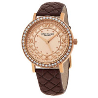 Rose gold-tone stainless steel case with a brown leather strap. Fixed rose gold-tone bezel set with crystals. Rose dial with rose gold-tone hands and dot hour markers. Arabic numerals appear at the 3, 6, 9 and 12 o'clock positions. Minute markers around the outer rim. Dial Type: Analog. Quartz movement. Scratch resistant mineral crystal. Pull / push crown. Solid case back. Round case shape. Case size: 38 mm. Case thickness: 9 mm. Tang clasp. Water resistant at 50 meters / 165 feet. Functions: hour, minute, second. Vogue Series. Fashion watch style. Stuhrling Original Vogue Rose Dial Brown Leather Ladies Watch M15451. INFORMATION Brand: Stuhrling Original Series: Vogue Collection Name: Vogue Gender: Womens Model: M15451 Movement: Quartz CASE Case Size: 38 mm Case Thickness: 9 mm Case Material: Stainless Steel Case Shape: Round Case Back: Solid BAND Band Material: Leather Band Type: Strap Band Color: Brown Band Length: 9.5 inches Clasp: Tang DIAL Dial Color: Rose Type: Analog Crystal: Scratch Resistant Mineral Hands: Rose Gold-tone Dial Markers: Dot Second Markers: Arabic Numerals appear at the 3, 6, 9 and 12 o'clock positions. Minute Markers around the outer rim Bezel: Fixed Bezel Color: Rose Gold-tone Bezel Material: Stainless Steel set with Crystals Crown: Pull / Push FEATURES Water Resistance: 50 meters / 165 feet Functions: Hour, Minute, Second Watch Features: Stainless Steel, Leather, Gold, Analog ADDITIONAL INFO Watch Style: Fashion Warranty: With Manufacturers Guarantee UPC Code: 190638125432 Jomashop Sku: ST-OM15451 Department: Watches Category: Watches