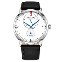 Silver-tone alloy case with a black leather strap. Fixed silver-tone alloy bezel. White dial with blue alpha-style hands and index hour markers. Minute markers around the outer rim. Dial Type: Analog. Two sub-dials displaying: seconds and 24 hour. Quartz movement. Scratch resistant mineral crystal. Pull / push crown. Solid case back. Round case shape. Case size: 42 mm. Case thickness: 9 mm. Band width: 22 mm. Band length: 8.5 inches. Tang clasp. Water resistant at 50 meters / 165 feet. Functions: hour, minute, second, 24 hour. Symphony Series. Dress watch style. Stuhrling Original Symphony Quartz White Dial Men's Watch M13662. INFORMATION Brand: Stuhrling Original Series: Symphony Collection Name: Symphony Gender: Mens Model: M13662 Movement: Quartz CASE Case Size: 42 mm Case Thickness: 9 mm Case Material: Alloy Case Shape: Round Case Back: Solid BAND Band Material: Leather Band Type: Strap Band Color: Black Band Length: 8.5 inches Band Width: 22 mm Clasp: Tang DIAL Dial Color: White Type: Analog Crystal: Scratch Resistant Mineral Hands: Blue Alpha-style Dial Markers: Index Second Markers: Minute Markers around the outer rim Sub Dials: Two - Seconds and 24 Hour Bezel: Fixed Bezel Color: Silver-tone Bezel Material: Alloy Crown: Pull / Push FEATURES Water Resistance: 50 meters / 165 feet Functions: Hour, Minute, Second, 24 Hour Watch Features: Leather, Analog ADDITIONAL INFO Watch Style: Dress Warranty: With Manufacturers Guarantee UPC Code: 190638111374 Jomashop Sku: ST-OM13662 Department: Watches Category: Watches