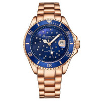 Rose gold-tone alloy case with a rose gold-tone stainless steel bracelet. Uni-directional rotating rose gold-tone alloy bezel with an inlaid blue ring. Blue mother of pearl (crystal-set) dial with luminous rose gold-tone hands and index hour markers. Minute markers around the outer rim. Dial Type: Analog. Luminescent hands. Date display at the 3 o'clock position. Quartz movement. Scratch resistant mineral crystal. Screw down crown. Solid case back. Round case shape. Case size: 38 mm. Case thickness: 10 mm. Deployment clasp with push button release. Water resistant at 100 meters / 330 feet. Functions: date, hour, minute, second. Vogue Series. Fashion watch style. Stuhrling Original Vogue Blue Dial Ladies Watch M15871. INFORMATION Brand: Stuhrling Original Series: Vogue Collection Name: Vogue Gender: Womens Model: M15871 Movement: Quartz CASE Case Size: 38 mm Case Thickness: 10 mm Case Material: Alloy Case Shape: Round Case Back: Solid BAND Band Material: Stainless Steel Band Type: Bracelet Band Color: Rose Gold-tone Band Length: 8.15 inches Clasp: Deployment with Push Button Release DIAL Dial Color: Blue Mother of Pearl (Crystal-set) Type: Analog Crystal: Scratch Resistant Mineral Hands: Luminous Rose Gold-tone Dial Markers: Index Second Markers: Minute Markers around the outer rim Luminiscence: Hands Bezel: Uni-directional Rotating Bezel Color: Rose Gold-tone Bezel Material: Alloy with an inlaid Blue Ring Crown: Screw Down FEATURES Water Resistance: 100 meters / 330 feet Calendar: Date display at the 3 o'clock position Functions: Date, Hour, Minute, Second Watch Features: Stainless Steel, Gold, Analog ADDITIONAL INFO Watch Style: Fashion Warranty: With Manufacturers Guarantee UPC Code: 190638129638 Jomashop Sku: ST-OM15871 Department: Watches Category: Watches