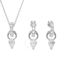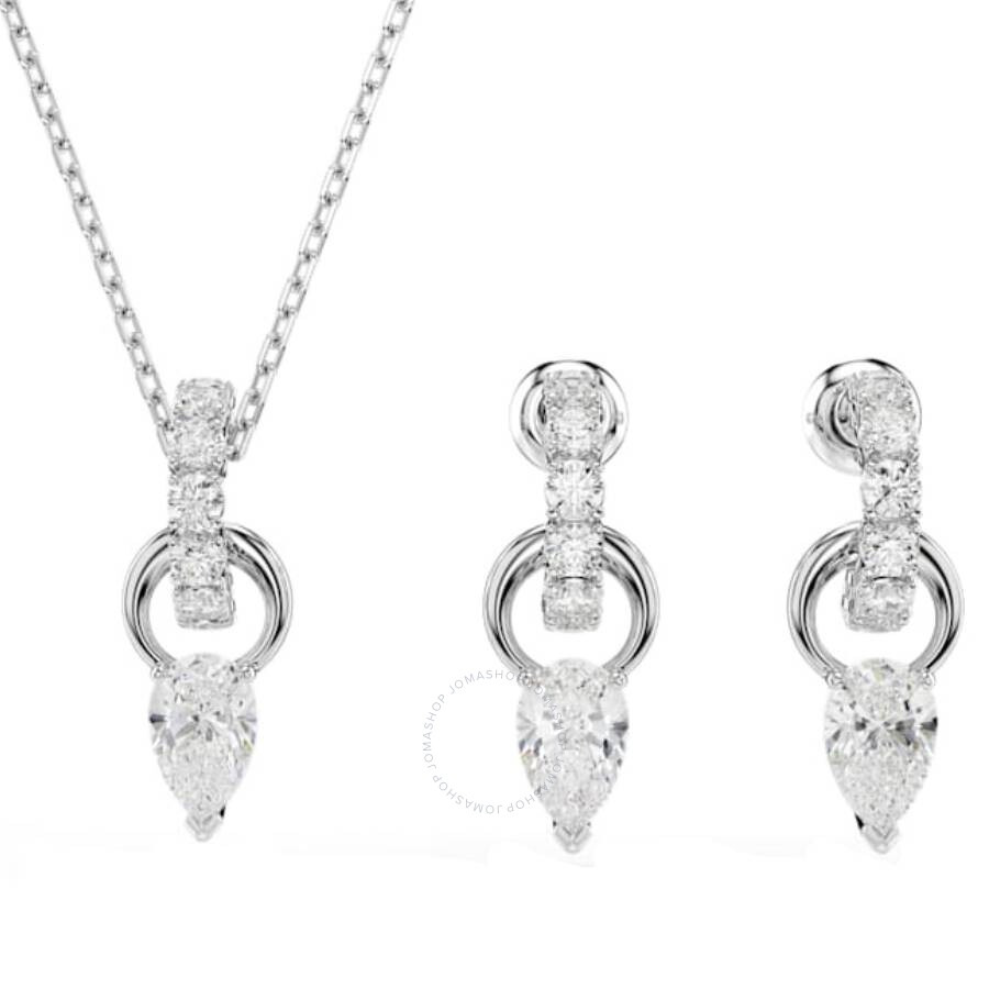 Swarovski Ladies Set. Mesmera series. SKU: 5723197. Color: White. Swarovski Mesmera Pear Cut Earring And Necklace Set. This pendant and earrings set showcases a harmonious blend of elegance and sparkle. Each shimmering piece features a pear-cut Swarovski Zirconia set on a small hoop, which is linked to a larger rhodium-plated hoop adorned with round-cut Swarovski Zirconia for added brilliance. The pendant is suspended from a delicate chain with a sliding mechanism, allowing for effortless length adjustment and a customizable fit. Necklace length: 14 7/8 - 17 3/4 inch. Earrings: 7/8 x 1/2 inch. Material: Crystals, Rhodium plated, Zirconia. GENERAL Stone Shape: Pear Color: White Collection Name: Mesmera INFORMATION Brand: Swarovski Series: Mesmera Gender: Womens Model: 5723197 DETAILS Ring Style: Fashion Material : Rhodium Plated Stone Cut: Pear ADDITIONAL INFO Jomashop Sku: SW5723197 Department: Jewelry Category: Set