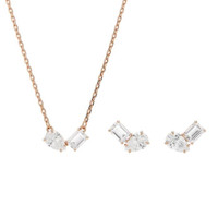 Swarovski Ladies Set. Mesmera series. SKU: 5734246. Swarovski Mesmera Pear Cut Rose Gold-Tone Plated Set. The Mesmera pendant and earrings set showcases eye-catching elegance in rose gold-tone plating. Each piece is adorned with a duo of prong-set Swarovski Zirconia, featuring a striking combination of pear and octagon-step cuts that beautifully catch the light and add refined brilliance to any look. Necklace length: 14 7/8 - 17 3/4 inch. Earrings: 3/8 x 5/8 inch. Material: Rose gold-tone plated, Zirconia. GENERAL Color: White Collection Name: Mesmera INFORMATION Brand: Swarovski Series: Mesmera Gender: Womens Model: 5734246 DETAILS Ring Style: Fashion ADDITIONAL INFO Jomashop Sku: SW5734246 Department: Jewelry Category: Set
