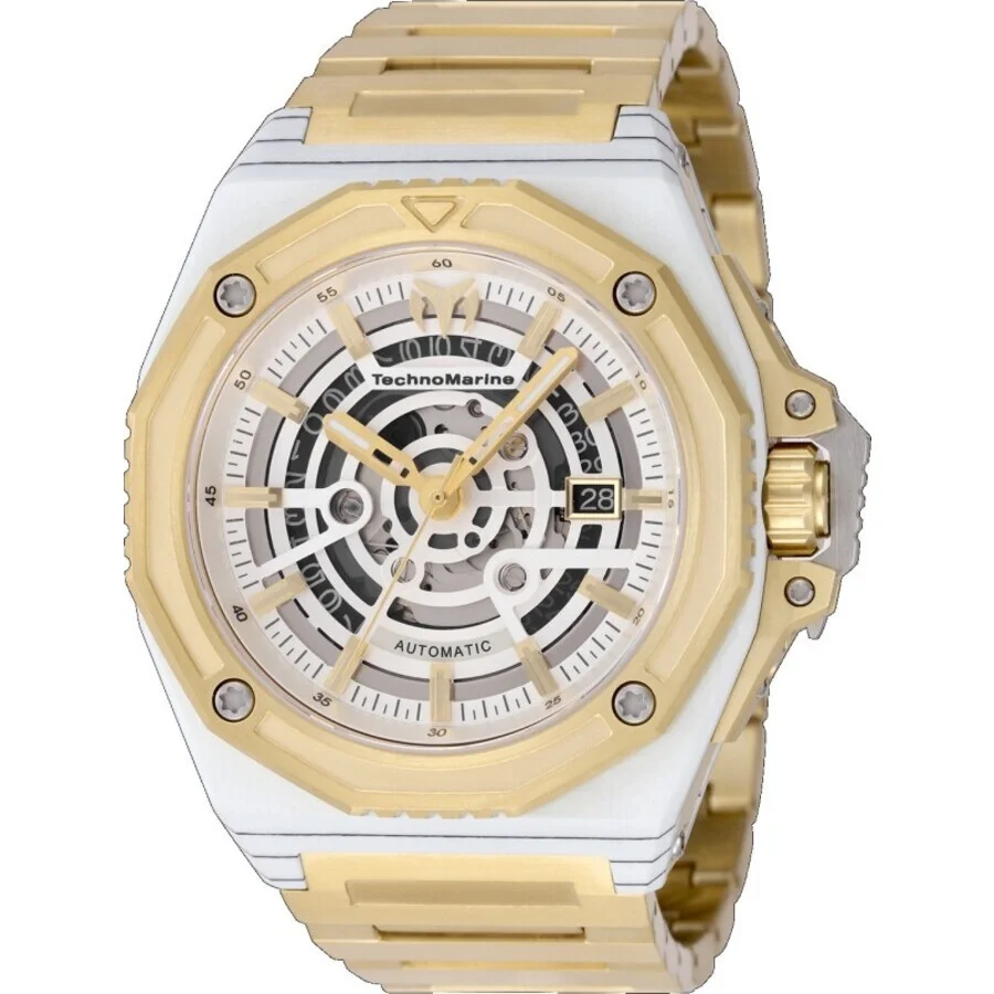 Two-tone (white and gold) carbon fiber and stainless steel case with a gold-tone stainless steel bracelet. Fixed gold-tone stainless steel bezel. Silver dial with gold-tone hands and index hour markers. Minute markers around the outer rim. Dial Type: Analog. Luminescent hands and markers. Date display at the 3 o'clock position. SII Caliber NH35A Automatic movement, containing 24 Jewels, bitting at 21600 vph, and has a power reserve of approximately 41 hours. Scratch resistant sapphire crystal. Pull / push crown. Transparent see through case back. Round case shape, case size: 45 mm, case thickness: 13.85 mm. Band width: 26.20 mm, band length: 6.75 inches. Butterfly clasp. Water resistant at 100 meters / 330 feet. Functions: date, hour, minute, second. Carbon Nautic Series. Casual watch style. Watch label: Japan Movt. TechnoMarine Carbon Nautic Automatic Silver Dial Men's Watch TM-525004. GENERAL Box Type: Original Box CASE Case Thickness: 13.85 mm Case Material: Carbon Fiber and Stainless Steel Case Shape: Round Case Back: Transparent See Through BAND Band Material: Stainless Steel Band Type: Bracelet Band Color: Gold-tone Band Length: 6.75 inches Band Width: 26.20 mm Clasp: Butterfly DIAL Dial Color: Silver Type: Analog Crystal: Sapphire Hands: Gold-tone Dial Markers: Index Second Markers: Minute Markers around the outer rim Luminiscence: Hands and Markers Bezel: Fixed Bezel Color: Gold-tone Bezel Material: Stainless Steel Crown: Pull / Push INFORMATION Brand: Technomarine Series: Carbon Nautic Collection Name: Carbon Nautic Gender: Mens Model: TM-525004 Watch Label: Japan Movt Movement: Automatic Engine: SII Caliber NH35A Power Reserve: 41 hours FEATURES Water Resistance: 100 meters / 330 feet Calendar: Date display at the 3 o'clock position Functions: Date, Hour, Minute, Second Watch Features: Analog, Gold, Stainless Steel ADDITIONAL INFO Watch Style: Casual Warranty: 2 Year Jomashop Warranty UPC Code: 886678472420 Jomashop Sku: TECHNO-525004 Department: Watches