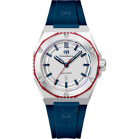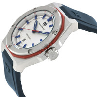 Two-tone (steel and red) plastic and stainless steel case with a blue silicone strap. Silver-tone stainless steel bezel. Silver-tone dial with blue hands and index hour markers. Minute markers around the outer rim. Dial Type: Analog. Luminescent hands and markers. Date display at the 6 o'clock position. Hattori Caliber PC32 quartz movement. Scratch resistant mineral crystal. Pull / push crown. Solid case back. Round case shape, case size: 45 mm, case thickness: 11.2 mm. Band width: 28 mm, band length: 7.75 inches. Buckle clasp. Water resistant at 100 meters / 330 feet. Functions: date, hour, minute, second. Coral Series. Casual watch style. Watch label: Japan Movt. Technomarine Coral Quartz Silver Dial Men's Watch TM-416091. GENERAL Box Type: Original Box CASE Case Thickness: 11.2 mm Case Material: Plastic and Stainless Steel Case Shape: Round Case Back: Solid BAND Band Material: Silicone Band Type: Strap Band Color: Blue Band Length: 7.75 inches Band Width: 28 mm Clasp: Buckle DIAL Dial Color: Silver-tone Type: Analog Crystal: Mineral Hands: Blue Dial Markers: Index Second Markers: Minute Markers around the outer rim Luminiscence: Hands and Markers Bezel: Fixed Bezel Color: Silver-tone Bezel Material: Stainless Steel Crown: Pull / Push INFORMATION Brand: Technomarine Series: Coral Collection Name: Coral Gender: Mens Model: TM-416091 Watch Label: Japan Movt Movement: Quartz Engine: Hattori Caliber PC32 FEATURES Water Resistance: 100 meters / 330 feet Calendar: Date display at the 6 o'clock position Functions: Date, Hour, Minute, Second Watch Features: Analog, Plastic, Stainless Steel ADDITIONAL INFO Watch Style: Casual Warranty: 2 Year Jomashop Warranty UPC Code: 886678470709 Jomashop Sku: TECHNOTM416091 Department: Watches