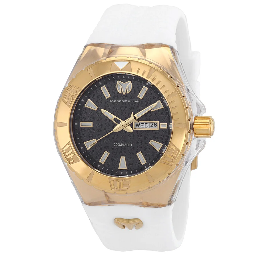 Gold-tone stainless steel case with a white silicone strap. Uni-directional rotating gold-tone stainless steel bezel. Black dial with gold-tone hands and index hour markers. Minute markers around the outer rim. Dial Type: Analog. Luminescent hands and markers. Day of the week and date display at the 3 o'clock position. Hattori Caliber PC33 quartz movement. Scratch resistant mineral crystal. Screw down crown. Solid case back. Round case shape, case size: 47.8 mm, case thickness: 14.7 mm. Band width: 29.0 mm, band length: 8.25 inches. Buckle clasp. Water resistant at 200 meters / 660 feet. Functions: date, day, hour, minute, second. Cruise Series. Casual watch style. Watch label: Japan Movt. Technomarine Cruise Monogram Quartz Black Dial Men's Watch TM-122013. GENERAL Box Type: Original Box CASE Case Diameter: 47 mm Case Thickness: 14.7 mm Case Material: Stainless Steel Case Shape: Round Case Back: Solid BAND Band Material: Silicone Band Type: Strap Band Color: White Band Length: 8.25 inches Band Width: 29.0 mm Clasp: Buckle DIAL Dial Color: Black Type: Analog Crystal: Mineral Hands: Gold-tone Dial Markers: Index Second Markers: Minute Markers around the outer rim Luminiscence: Hands and Markers Bezel: Uni-directional Rotating Bezel Color: Gold-tone Bezel Material: Stainless Steel Crown: Screw Down INFORMATION Brand: Technomarine Series: Cruise Collection Name: Cruise Gender: Mens Model: TM-122013 Watch Label: Japan Movt Movement: Quartz Engine: Hattori Caliber PC33 FEATURES Water Resistance: 200 meters / 660 feet Calendar: Day of the Week and Date display at the 3 o'clock position Functions: Date, Day, Hour, Minute, Second Watch Features: Analog, Gold, Stainless Steel ADDITIONAL INFO Watch Style: Casual Warranty: 2 Year Jomashop Warranty UPC Code: 886678487578 Jomashop Sku: TECHNOTM122013 Department: Watches