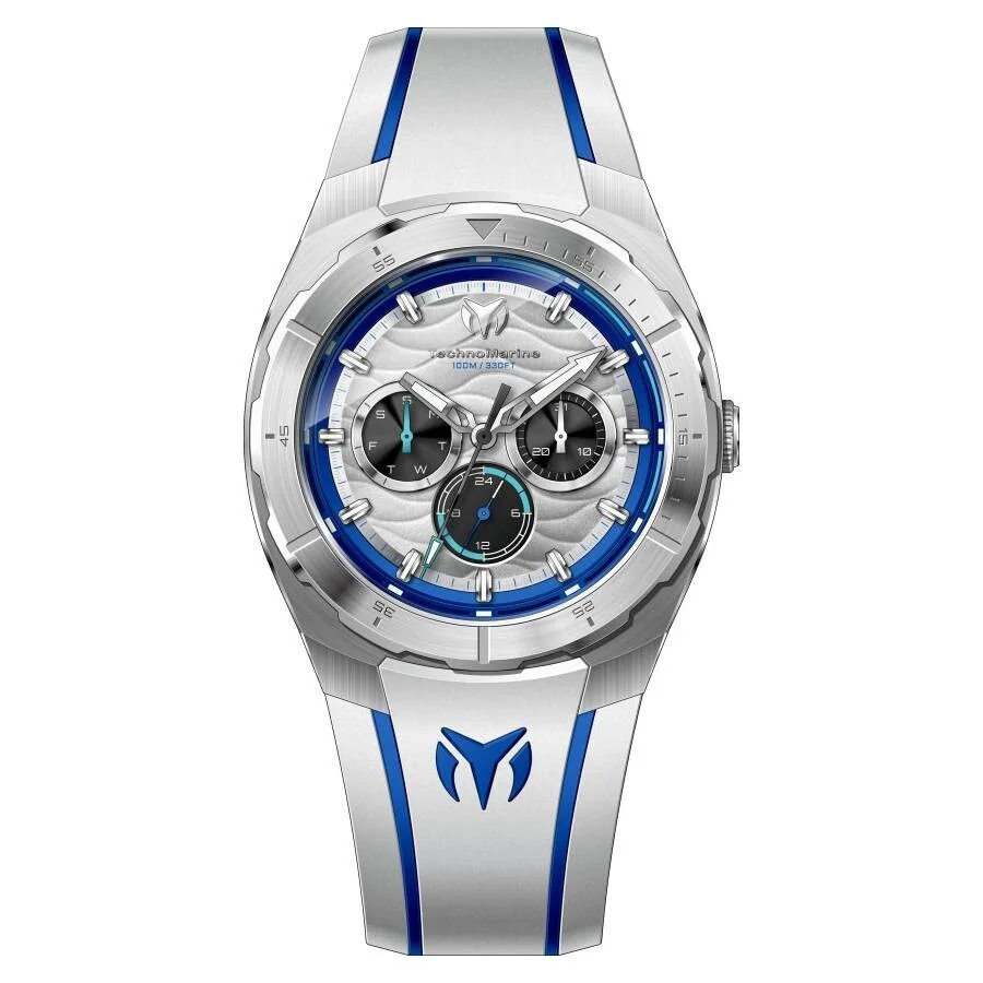 Silver-tone stainless steel case with a white silicone strap. Uni-directional rotating silver-tone stainless steel bezel. Silver-tone hands and index hour markers. Minute markers around the outer rim. Dial Type: Analog. Three sub-dials displaying: date, day and 24 hour. TMI Caliber VH63 quartz movement. Scratch resistant mineral crystal. Pull / push crown. Solid case back. Round case shape, case size: 43 mm. Band width: 28 mm. Buckle clasp. Water resistant at 100 meters / 330 feet. Functions: date, day, hour, minute, second. Cruise Series. Casual watch style. Watch label: Japan Movt. Technomarine Cruise Quartz Men's Watch TM-125016. GENERAL Box Type: Original Box CASE Case Material: Stainless Steel Case Shape: Round Case Back: Solid BAND Band Material: Silicone Band Type: Strap Band Color: White Band Width: 28 mm Clasp: Buckle DIAL Type: Analog Crystal: Scratch Resistant Mineral Hands: Silver-tone Dial Markers: Index Second Markers: Minute Markers around the outer rim Sub Dials: Three - Date, Day and 24 Hour Bezel: Uni-directional Rotating Bezel Color: Silver-tone Bezel Material: Stainless Steel Crown: Pull / Push INFORMATION Brand: Technomarine Series: Cruise Collection Name: Cruise Gender: Mens Model: TM-125016 Watch Label: Japan Movt Movement: Quartz Engine: TMI Caliber VH63 FEATURES Water Resistance: 100 meters / 330 feet Functions: Date, Day, Hour, Minute, Second Watch Features: Stainless Steel, Analog ADDITIONAL INFO Watch Style: Casual Warranty: 2 Year Jomashop Warranty UPC Code: 886678472727 Jomashop Sku: TECHNO-125016 Department: Watches