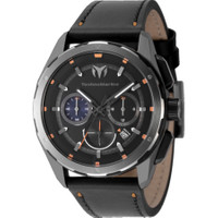 Two-tone (grey and black) stainless steel case with a black leather strap. Fixed grey stainless steel bezel. Black dial with black hands and index hour markers. Minute scale around the inner rim. Dial Type: Analog. Luminescent hands and markers. Date display between 4 and 5 o'clock position. Chronograph - three sub-dials displaying: 60 second, 60 minute and 24 hour. Hattori Caliber VD53C quartz movement. Scratch resistant mineral crystal. Pull / push crown. Solid case back. Round case shape, case size: 43 mm, case thickness: 12.5 mm. Band width: 24 mm, band length: 7.75 inches. Buckle clasp. Water resistant at 100 meters / 330 feet. Functions: chronograph, date, GMT, second time zone, hour, minute, second. Ocean Series. Sport watch style. Watch label: Japan Movt. Technomarine Ocean Chronograph GMT Quartz Black Dial Men's Watch TM-318087. GENERAL Box Type: Original Box CASE Case Thickness: 12.5 mm Case Material: Stainless Steel Case Shape: Round Case Back: Solid BAND Band Material: Leather Band Type: Strap Band Color: Black Band Length: 7.75 inches Band Width: 24 mm Clasp: Buckle DIAL Dial Color: Black Type: Analog Crystal: Mineral Hands: Black Dial Markers: Index Second Markers: Minute Scale around the inner rim Sub Dials: Three - 60 second, 60 minute and 24 hour Luminiscence: Hands and Markers Bezel: Fixed Bezel Color: Grey Bezel Material: Stainless Steel Crown: Pull / Push INFORMATION Brand: Technomarine Series: Ocean Collection Name: Ocean Gender: Mens Model: TM-318087 Watch Label: Japan Movt Movement: Quartz Engine: Hattori Caliber VD53C FEATURES Water Resistance: 100 meters / 330 feet Calendar: Date display between 4 and 5 o'clock position Functions: Chronograph, Date, GMT, Second Time Zone, Hour, Minute, Second Watch Features: Analog, GMT, Leather, Stainless Steel, Chronograph, Time Zone ADDITIONAL INFO Watch Style: Sport Warranty: 2 Year Jomashop Warranty UPC Code: 886678468638 Jomashop Sku: TECHNOTM318087 Department: Watches
