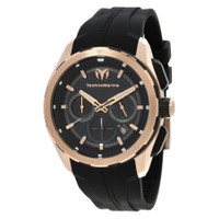 Two-tone (black and rose gold) stainless steel case with a black silicone strap. Fixed rose gold-tone stainless steel bezel. Black dial with rose gold-tone hands and index hour markers. Minute scale around the inner rim. Dial Type: Analog. Luminescent hands and markers. Date display between 4 and 5 o'clock position. Chronograph - three sub-dials displaying: 60 second, 60 minute and 24 hour. VD53 quartz movement. Scratch resistant mineral crystal. Pull / push crown. Solid case back. Round case shape, case size: 43 mm, case thickness: 12.5 mm. Band width: 24 mm, band length: 7.75 inches. Buckle clasp. Water resistant at 10 atm. Functions: chronograph, date, GMT, second time zone, hour, minute, second. Ocean Series. Sport watch style. Watch label: Japan Movt. Technomarine OCEAN Chronograph GMT Quartz Black Dial Men's Watch TM-318102. GENERAL Box Type: Original Box CASE Case Thickness: 12.5 mm Case Material: Stainless Steel Case Shape: Round Case Back: Solid BAND Band Material: Silicone Band Type: Strap Band Color: Black Band Length: 7.75 inches Band Width: 24 mm Clasp: Buckle DIAL Dial Color: Black Type: Analog Crystal: Mineral Hands: Rose Gold-tone Dial Markers: Index Second Markers: Minute Scale around the inner rim Sub Dials: Three - 60 second, 60 minute and 24 hour Luminiscence: Hands and Markers Bezel: Fixed Bezel Color: Rose Gold-tone Bezel Material: Stainless Steel Crown: Pull / Push INFORMATION Brand: Technomarine Series: Ocean Collection Name: OCEAN Gender: Mens Model: TM-318102 Watch Label: Japan Movt Movement: Quartz Engine: VD53 FEATURES Water Resistance: 10 atm Calendar: Date display between 4 and 5 o'clock position Functions: Chronograph, Date, GMT, Second Time Zone, Hour, Minute, Second Watch Features: Analog, GMT, Gold, Stainless Steel, Chronograph, Time Zone ADDITIONAL INFO Watch Style: Sport Warranty: 2 Year Jomashop Warranty UPC Code: 886678468782 Jomashop Sku: TECHNOTM318102 Department: Watches
