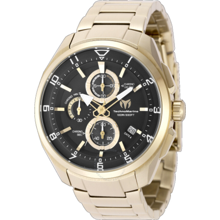 Gold-tone stainless steel case and bracelet. Fixed gold-tone stainless steel bezel. Black dial with gold-tone hands and Arabic numeral hour markers. Minute markers around the outer rim. Dial Type: Analog. Luminescent hands and markers. Date display between 4 and 5 o'clock position. Chronograph - three sub-dials displaying: 60 second, 60 minute and 1/10th of a second. VD57 quartz movement. Scratch resistant mineral crystal. Pull / push crown. Solid case back. Round case shape, case size: 44 mm, case thickness: 12.1 mm. Band width: 22 mm, band length: 7 inches. Fold over clasp. Water resistant at 100 meters / 330 feet. Functions: chronograph, date, hour, minute, second. Ocean Series. Sport watch style. Watch label: Japan Movt. Technomarine OCEAN Chronograph Quartz Black Dial Men's Watch TM-318120. GENERAL Box Type: Original Box CASE Case Thickness: 12.1 mm Case Material: Stainless Steel Case Shape: Round Case Back: Solid BAND Band Material: Stainless Steel Band Type: Bracelet Band Color: Gold-tone Band Length: 7 inches Band Width: 22 mm Clasp: Fold Over DIAL Dial Color: Black Type: Analog Crystal: Mineral Hands: Gold-tone Dial Markers: Arabic Numeral Second Markers: Minute Markers around the outer rim Sub Dials: Three - 60 Second, 60 Minute and 1/10th of a Second Luminiscence: Hands and Markers Bezel: Fixed Bezel Color: Gold-tone Bezel Material: Stainless Steel Crown: Pull / Push INFORMATION Brand: Technomarine Series: Ocean Collection Name: Ocean Gender: Mens Model: TM-318120 Watch Label: Japan Movt Movement: Quartz Engine: Hattori Caliber VD57 FEATURES Water Resistance: 100 meters / 330 feet Calendar: Date display between 4 and 5 o'clock position Functions: Chronograph, Date, Hour, Minute, Second Watch Features: Analog, Gold, Stainless Steel, Chronograph ADDITIONAL INFO Watch Style: Sport Warranty: 2 Year Jomashop Warranty UPC Code: 886678470105 Jomashop Sku: TECHNOTM318120 Department: Watches