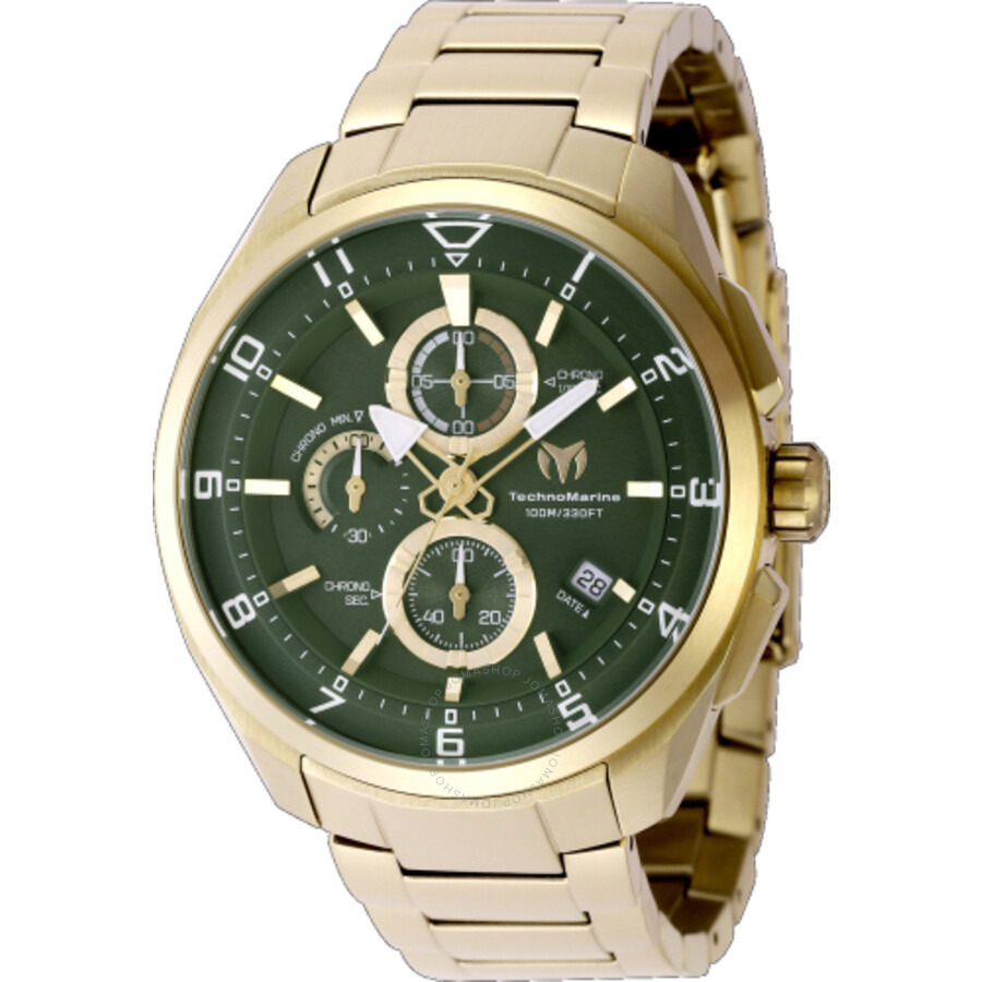 Gold-tone stainless steel case and bracelet. Fixed gold-tone stainless steel bezel. Olive green dial with gold-tone hands and Arabic numeral hour markers. Minute markers around the outer rim. Dial Type: Analog. Date display between 4 and 5 o'clock position. Chronograph - three sub-dials displaying: 60 second, 60 minute and 1/10th of a second. Hattori Caliber VD57 quartz movement. Scratch resistant mineral crystal. Pull / push crown. Solid case back. Round case shape, case size: 44 mm, case thickness: 12.1 mm. Band width: 22 mm, band length: 7 inches. Fold over clasp. Water resistant at 100 meters / 330 feet. Functions: chronograph, date, hour, minute, second. Ocean Series. Sport watch style. Watch label: Japan Movt. Technomarine OCEAN Chronograph Quartz Men's Watch TM-318131. GENERAL Box Type: Original Box CASE Case Thickness: 12.1 mm Case Material: Stainless Steel Case Shape: Round Case Back: Solid BAND Band Material: Stainless Steel Band Type: Bracelet Band Color: Gold-tone Band Length: 7 inches Band Width: 22 mm Clasp: Fold Over DIAL Dial Color: Olive Green Type: Analog Crystal: Mineral Hands: Gold-tone Dial Markers: Arabic Numeral Second Markers: Minute Markers around the outer rim Sub Dials: Three - 60 Second, 60 Minute and 1/10th of a Second Bezel: Fixed Bezel Color: Gold-tone Bezel Material: Stainless Steel Crown: Pull / Push INFORMATION Brand: Technomarine Series: Ocean Collection Name: Ocean Gender: Mens Model: TM-318131 Watch Label: Japan Movt Movement: Quartz Engine: Hattori Caliber VD57 FEATURES Water Resistance: 100 meters / 330 feet Calendar: Date display between 4 and 5 o'clock position Functions: Chronograph, Date, Hour, Minute, Second Watch Features: Analog, Gold, Stainless Steel, Chronograph ADDITIONAL INFO Watch Style: Sport Warranty: 2 Year Jomashop Warranty UPC Code: 886678470211 Jomashop Sku: TECHNOTM318131 Department: Watches