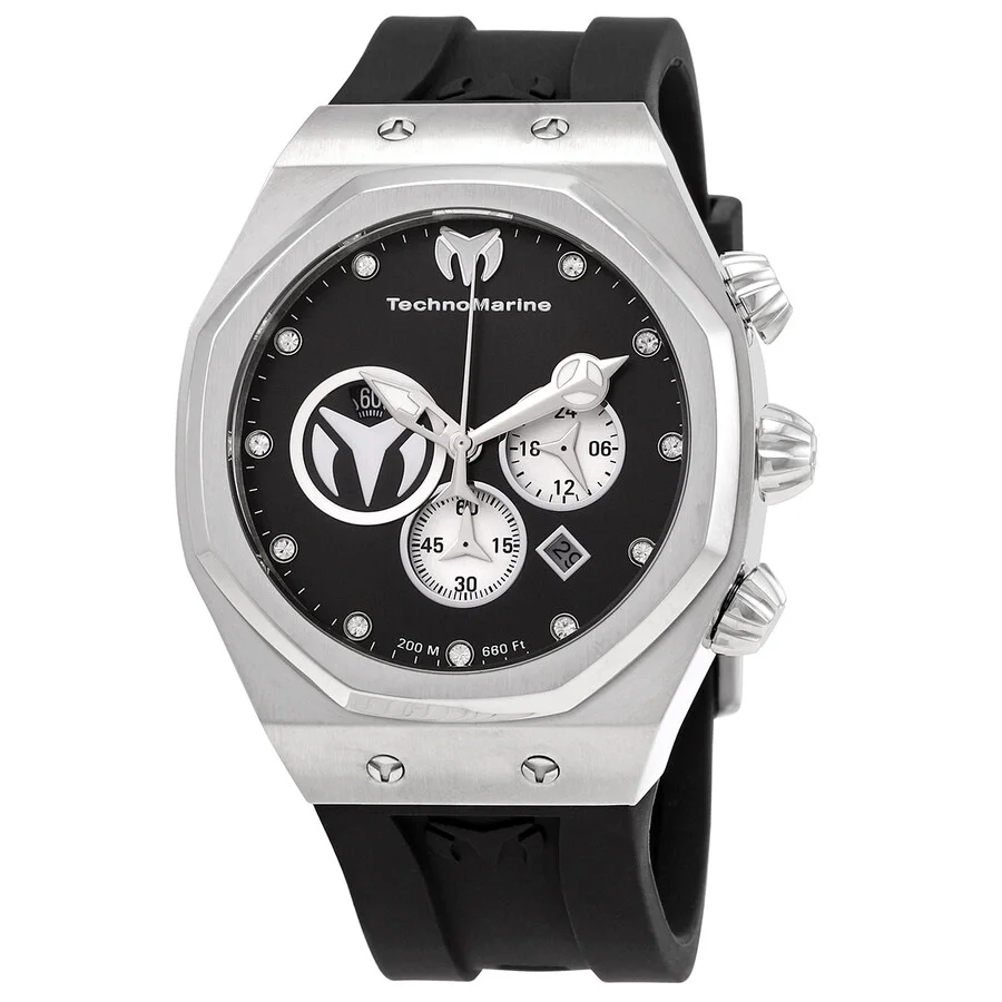 Silver-tone stainless steel case with a black silicone strap. Fixed silver-tone stainless steel bezel. Black dial with luminous silver-tone hands and diamond hour markers. Minute markers around the outer rim. Dial Type: Analog. Luminescent hands. Date display between 4 and 5 o'clock position. Chronograph - three sub-dials displaying: 60 second, 60 minute and 24 hour. Hattori Caliber VD53 quartz movement. Scratch resistant mineral crystal. Screw down crown. Solid case back. Octagon case shape, case size: 45 mm, case thickness: 14.2 mm. Band width: 24 mm. Tang clasp. Water resistant at 200 meters / 660 feet. Functions: chronograph, date, GMT, second time zone, hour, minute, second. Reef Sun Series. Sport watch style. Watch label: Japan Movt. Technomarine Reef Sun Chronograph Quartz Diamond Black Dial Men's Watch TM-520000. GENERAL Box Type: Original Box CASE Case Diameter: 45 mm Case Thickness: 14.2 mm Case Material: Stainless Steel Case Shape: Octagon Case Back: Solid BAND Band Material: Silicone Band Type: Strap Band Color: Black Band Width: 24 mm Clasp: Tang DIAL Dial Color: Black Type: Analog Crystal: Scratch Resistant Mineral Hands: Luminous Silver-tone Dial Markers: Diamond Second Markers: Minute Markers around the outer rim Sub Dials: Three - 60 second, 60 minute and 24 hour Luminiscence: Hands Bezel: Fixed Bezel Color: Silver-tone Bezel Material: Stainless Steel Crown: Screw Down INFORMATION Brand: Technomarine Series: Reef Sun Collection Name: Reef Sun Gender: Mens Model: TM-520000 Watch Label: Japan Movt Movement: Quartz Engine: Hattori Caliber VD53 FEATURES Water Resistance: 200 meters / 660 feet Calendar: Date display between 4 and 5 o'clock position Functions: Chronograph, Date, GMT, Second Time Zone, Hour, Minute, Second Watch Features: Analog, GMT, Stainless Steel, Chronograph, Diamond, Time Zone ADDITIONAL INFO Watch Style: Sport Warranty: 2 Year Jomashop Warranty UPC Code: 886678941360 Jomashop Sku: TECHNO-520000 Department: Watches Category: Watches