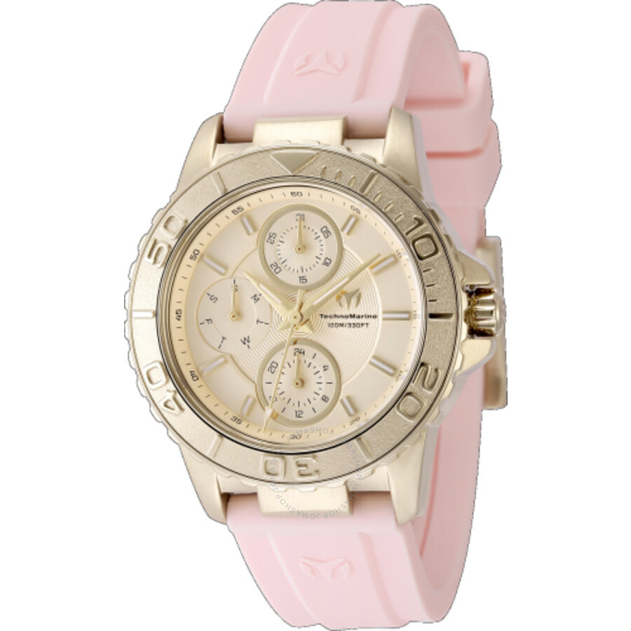 Gold-tone stainless steel case with a pink silicone strap. Fixed gold-tone stainless steel bezel. Gold-tone dial with gold-tone hands and index hour markers. Minute markers around the outer rim. Dial Type: Analog. Luminescent hands and markers. Date display at the 12 o'clock position. Three sub-dials displaying: date, day and 24 hour. VH67 quartz movement. Scratch resistant mineral crystal. Pull / push crown. Solid case back. Round case shape, case size: 36 mm, case thickness: 10.3 mm. Band width: 18 mm, band length: 7.25 inches. Buckle clasp. Water resistant at 100 meters / 330 feet. Functions: date, day, second time zone, hour, minute, second. Sea Series. Casual watch style. Watch label: Japan Movt. Technomarine Sea Quartz Gold Dial Ladies Watch TM-725018. GENERAL Box Type: Original Box CASE Case Thickness: 10.3 mm Case Material: Stainless Steel Case Shape: Round Case Back: Solid BAND Band Material: Silicone Band Type: Strap Band Color: Pink Band Length: 7.25 inches Band Width: 18 mm Clasp: Buckle DIAL Dial Color: Gold-tone Type: Analog Crystal: Mineral Hands: Gold-tone Dial Markers: Index Second Markers: Minute Markers around the outer rim Sub Dials: Three - Date, Day and 24 Hour Luminiscence: Hands and Markers Bezel: Fixed Bezel Color: Gold-tone Bezel Material: Stainless Steel Crown: Pull / Push INFORMATION Brand: Technomarine Series: Sea Collection Name: Sea Gender: Womens Model: TM-725018 Watch Label: Japan Movt Movement: Quartz Engine: TMI Caliber VH67 FEATURES Water Resistance: 100 meters / 330 feet Calendar: Date display at the 12 o'clock position Functions: Date, Day, Second Time Zone, Hour, Minute, Second Watch Features: Analog, Gold, Stainless Steel, Time Zone ADDITIONAL INFO Watch Style: Casual Warranty: 2 Year Jomashop Warranty UPC Code: 886678470501 Jomashop Sku: TECHNOTM725018 Department: Watches
