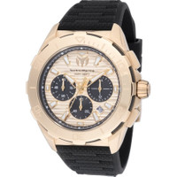 Gold-tone stainless steel case with a black silicone strap. Gold-tone stainless steel bezel. Gold-tone dial with gold-tone hands and index hour markers. Minute markers around the outer rim. Dial Type: Analog. Luminescent hands and markers. Date display between 4 and 5 o'clock position. Chronograph - three sub-dials displaying: 60 second, 60 minute and 24 hour. Hattori Caliber VD53 quartz movement. Scratch resistant mineral crystal. Pull / push crown. Solid case back. Round case shape, case size: 44 mm, case thickness: 11.6 mm. Band width: 27.36 mm, band length: 7.75 inches. Buckle clasp. Water resistant at 100 meters / 330 feet. Functions: chronograph, date, GMT, second time zone, hour, minute, second. Seven Seas Series. Sport watch style. Watch label: Japan Movt. TechnoMarine Seven Seas Chronograph GMT Quartz Gold Dial Men's Watch TM-725023. GENERAL Box Type: Original Box CASE Case Diameter: 44 mm Case Thickness: 11.6 mm Case Material: Stainless Steel Case Shape: Round Case Back: Solid BAND Band Material: Silicone Band Type: Strap Band Color: Black Band Length: 7.75 inches Band Width: 27.36 mm Clasp: Buckle DIAL Dial Color: Gold-tone Type: Analog Crystal: Mineral Hands: Gold-tone Dial Markers: Index Second Markers: Minute Markers around the outer rim Sub Dials: Three - 60 second, 60 minute and 24 hour Luminiscence: Hands and Markers Bezel Color: Gold-tone Bezel Material: Stainless Steel Crown: Pull / Push INFORMATION Brand: Technomarine Series: Seven Seas Collection Name: Seven Seas Gender: Mens Model: TM-725023 Watch Label: Japan Movt Movement: Quartz Engine: Hattori Caliber VD53 FEATURES Water Resistance: 100 meters / 330 feet Calendar: Date display between 4 and 5 o'clock position Functions: Chronograph, Date, GMT, Second Time Zone, Hour, Minute, Second Watch Features: Analog, GMT, Gold, Stainless Steel, Chronograph, Time Zone ADDITIONAL INFO Watch Style: Sport Warranty: 2 Year Jomashop Warranty UPC Code: 886678471058 Jomashop Sku: TECHNO-725023 Department: Watches
