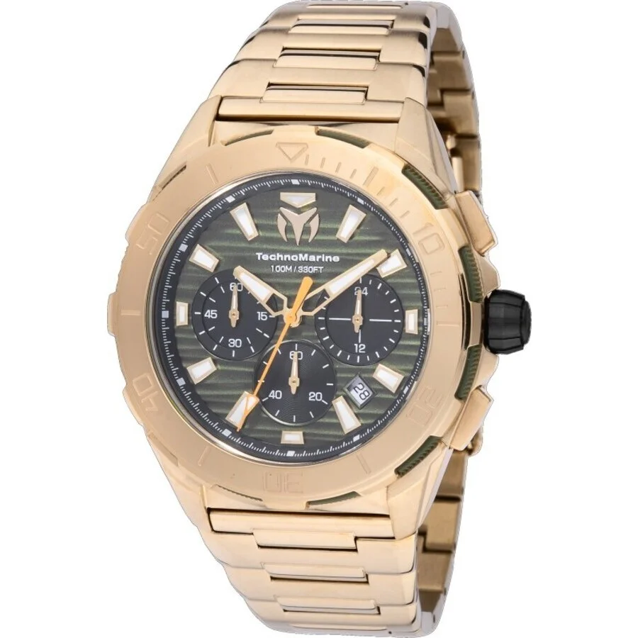 Two-tone (black and gold) stainless steel case with a gold-tone stainless steel bracelet. Gold-tone stainless steel bezel. Olive green dial with gold-tone hands and index hour markers. Minute markers around the outer rim. Dial Type: Analog. Luminescent hands and markers. Date display between 4 and 5 o'clock position. Chronograph - three sub-dials displaying: 60 second, 60 minute and 24 hour. Hattori Caliber VD53 quartz movement. Scratch resistant mineral crystal. Pull / push crown. Solid case back. Round case shape, case size: 44 mm, case thickness: 11.6 mm. Band width: 26.6 mm, band length: 6.75 inches. Fold over clasp with a safety release. Water resistant at 100 meters / 330 feet. Functions: chronograph, date, GMT, second time zone, hour, minute, second. Seven Seas Series. Sport watch style. Watch label: Japan Movt. TechnoMarine Seven Seas GMT Chronograph Olive Green and Black Dial Men's Watch TM-725031. GENERAL Box Type: Original Box CASE Case Diameter: 44 mm Case Thickness: 11.6 mm Case Material: Stainless Steel Case Shape: Round Case Back: Solid BAND Band Material: Stainless Steel Band Type: Bracelet Band Color: Gold-tone Band Length: 6.75 inches Band Width: 26.6 mm Clasp: Fold Over with Safety Release DIAL Dial Color: Olive Green Type: Analog Crystal: Mineral Hands: Gold-tone Dial Markers: Index Second Markers: Minute Markers around the outer rim Sub Dials: Three - 60 second, 60 minute and 24 hour Luminiscence: Hands and Markers Bezel Color: Gold-tone Bezel Material: Stainless Steel Crown: Pull / Push INFORMATION Brand: Technomarine Series: Seven Seas Collection Name: Seven Seas Gender: Mens Model: TM-725031 Watch Label: Japan Movt Movement: Quartz Engine: Hattori Caliber VD53 FEATURES Water Resistance: 100 meters / 330 feet Calendar: Date display between 4 and 5 o'clock position Functions: Chronograph, Date, GMT, Second Time Zone, Hour, Minute, Second Watch Features: Analog, GMT, Gold, Stainless Steel, Chronograph, Time Zone ADDITIONAL INFO Watch Style: Sport Warranty: 2 Year Jomashop Warranty UPC Code: 886678471201 Jomashop Sku: TECHNO-725031 Department: Watches
