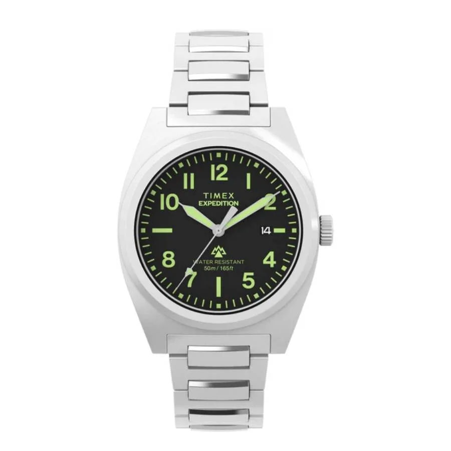 Silver-tone stainless steel case and bracelet. Fixed silver-tone stainless steel bezel. Black dial with silver-tone hands and Arabic numeral hour markers. Minute markers around the outer rim. Dial Type: Analog. Luminescent hands and markers. Date display at the 3 o'clock position. Quartz movement. Scratch resistant mineral crystal. Pull / push crown. Solid case back. Round case shape, case size: 39 mm, case thickness: 10 mm. Band width: 20 mm. Fold over clasp with a safety release. Water resistant at 50 meters / 165 feet. Functions: date, hour, minute, second. Expedition North Series. Casual watch style. Item Variations: TW2Y18300VQ. Timex Expedition North Quartz Black Dial Men's Watch TW2Y18300. GENERAL Box Type: Original Box CASE Case Diameter: 39 mm Case Thickness: 10 mm Case Material: Stainless Steel Case Shape: Round Case Back: Solid BAND Band Material: Stainless Steel Band Type: Bracelet Band Color: Silver-tone Band Width: 20 mm Clasp: Fold Over with Safety Release DIAL Dial Color: Black Type: Analog Crystal: Scratch Resistant Mineral Hands: Silver-tone Dial Markers: Arabic Numeral Second Markers: Minute Markers around the outer rim Luminiscence: Hands and Markers Bezel: Fixed Bezel Color: Silver-tone Bezel Material: Stainless Steel Crown: Pull / Push INFORMATION Brand: Timex Series: Expedition North Collection Name: Expedition North Gender: Mens Model: TW2Y18300 Movement: Quartz FEATURES Water Resistance: 50 meters / 165 feet Calendar: Date display at the 3 o'clock position Functions: Date, Hour, Minute, Second Watch Features: Stainless Steel, Analog ADDITIONAL INFO Watch Style: Casual Warranty: 1 Year Jomashop Warranty UPC Code: 194366456745 Jomashop Sku: TXTW2Y18300 Item Variation: TW2Y18300VQ Department: Watches