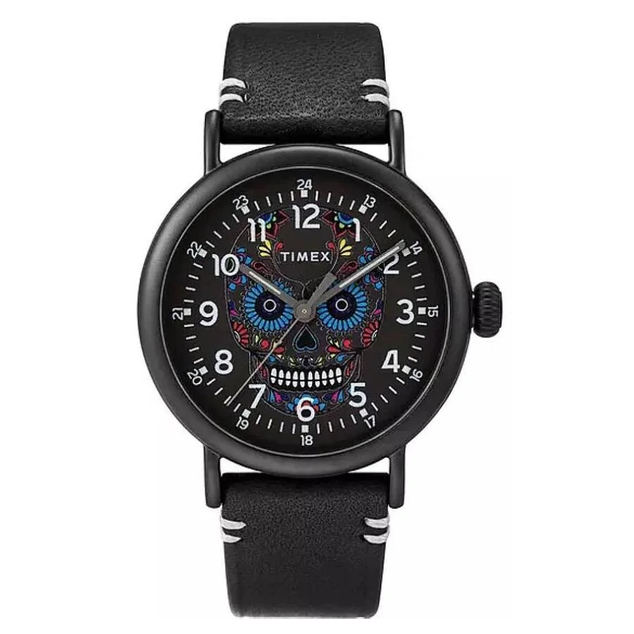 Black stainless steel case with a black leather strap. Fixed black stainless steel bezel. Black dial with black hands and Arabic numeral hour markers. Dial Type: Analog. Luminescent indiglo. Quartz movement. Scratch resistant mineral crystal. Pull / push crown. Solid case back. Round case shape, case size: 40 mm. Buckle clasp. Water resistant at 50 meters / 165 feet. Functions: hour, minute, second. Standard Series. Casual watch style. Item Variations: TW2U95200BR. Timex Standard Dia de los Muertos Quartz Men's Watch TW2U95200. GENERAL Box Type: Original Box CASE Case Diameter: 40 mm Case Material: Stainless Steel Case Shape: Round Case Back: Solid BAND Band Material: Leather Band Type: Strap Band Color: Black Clasp: Buckle DIAL Dial Color: Black Type: Analog Crystal: Scratch Resistant Mineral Hands: Black Dial Markers: Arabic Numeral Luminiscence: Indiglo Bezel: Fixed Bezel Color: Black Bezel Material: Stainless Steel Crown: Pull / Push INFORMATION Brand: Timex Series: Standard Collection Name: Standard Gender: Mens Model: TW2U95200 Movement: Quartz FEATURES Water Resistance: 50 meters / 165 feet Functions: Hour, Minute, Second Watch Features: Analog, Leather, Stainless Steel ADDITIONAL INFO Watch Style: Casual Warranty: 1 Year Jomashop Warranty UPC Code: 194366137972 Jomashop Sku: TXTW2U95200 Item Variation: TW2U95200BR Department: Watches