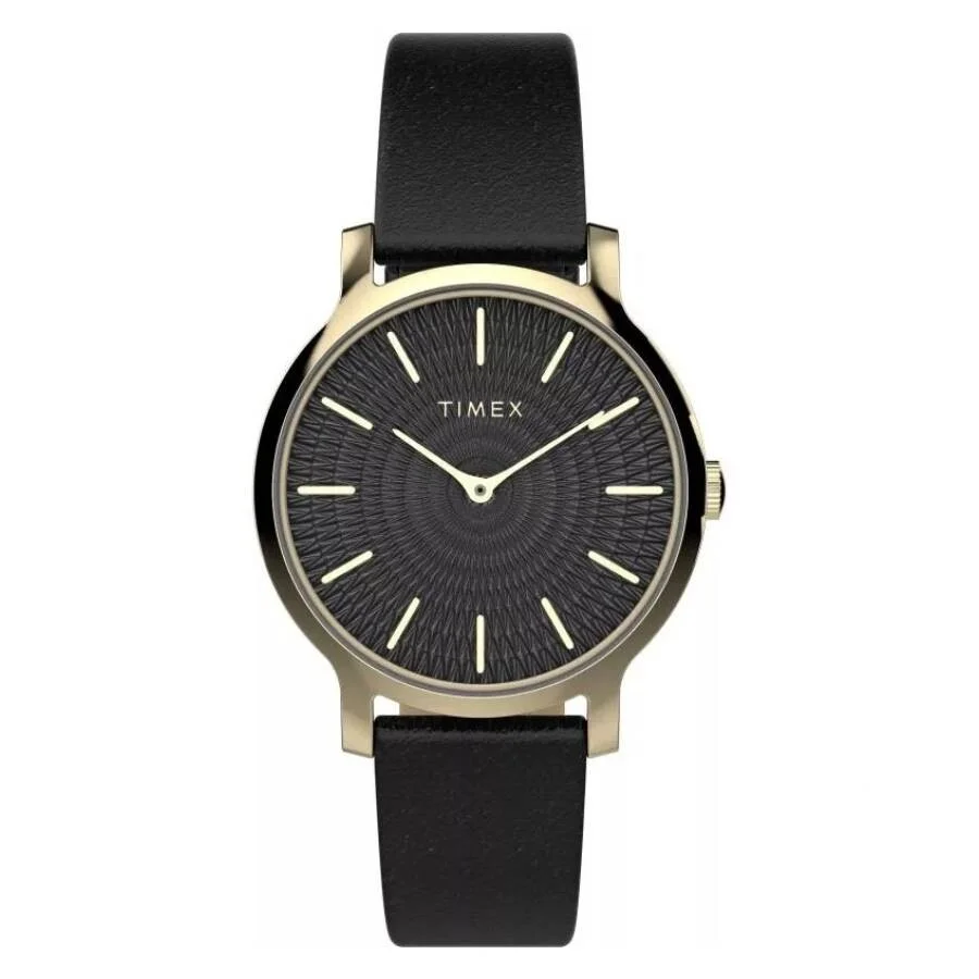 Gold-tone brass case with a black leather strap. Fixed gold-tone brass bezel. Black dial with gold-tone hands and index hour markers. Dial Type: Analog. Quartz movement. Scratch resistant mineral crystal. Pull / push crown. Solid case back. Round case shape, case size: 34 mm, case thickness: 7 mm. Band width: 16 mm. Buckle clasp. Functions: hour, minute. Transcend Series. Casual watch style. Timex Transcend Quartz Black Dial Ladies Watch TW2V92600. GENERAL Box Type: Original Box CASE Case Diameter: 34 mm Case Thickness: 7 mm Case Material: Brass Case Shape: Round Case Back: Solid BAND Band Material: Leather Band Type: Strap Band Color: Black Band Width: 16 mm Clasp: Buckle DIAL Dial Color: Black Type: Analog Crystal: Scratch Resistant Mineral Hands: Gold-tone Dial Markers: Index Bezel: Fixed Bezel Color: Gold-tone Bezel Material: Brass Crown: Pull / Push INFORMATION Brand: Timex Series: Transcend Collection Name: Transcend Gender: Womens Model: TW2V92600 Movement: Quartz FEATURES Functions: Hour, Minute Watch Features: Analog, Gold, Leather ADDITIONAL INFO Watch Style: Casual Warranty: 1 Year Jomashop Warranty UPC Code: 194366292671 Jomashop Sku: TXTW2V92600 Department: Watches
