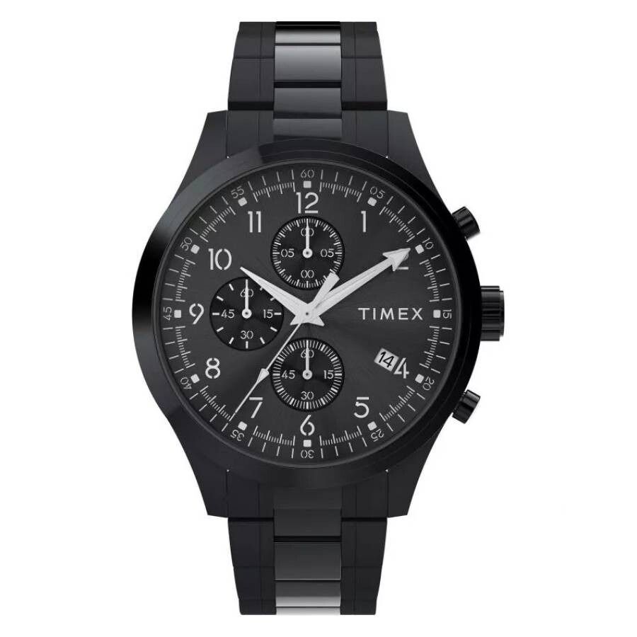 Black stainless steel case and bracelet. Fixed black stainless steel bezel. Black dial with silver-tone hands and Arabic numeral hour markers. Minute markers around the outer rim. Dial Type: Analog. Date display at the 4 o'clock position. Chronograph - three sub-dials displaying: 60 second, 60 minute and 1/10th of a second. Quartz movement. Scratch resistant mineral crystal. Pull / push crown. Solid case back. Round case shape, case size: 43 mm. Band width: 20 mm. Deployment with push button release clasp. Water resistant at 50 meters / 165 feet. Functions: chronograph, date, hour, minute, second. Trend Series. Sport watch style. Timex Trend Chronograph Quartz Black Dial Men's Watch TW2Y01600. GENERAL Box Type: Original Box CASE Case Diameter: 43 mm Case Material: Stainless Steel Case Shape: Round Case Back: Solid BAND Band Material: Stainless Steel Band Type: Bracelet Band Color: Black Band Width: 20 mm Clasp: Deployment with Push Button Release DIAL Dial Color: Black Type: Analog Crystal: Scratch Resistant Mineral Hands: Silver-tone Dial Markers: Arabic Numeral Second Markers: Minute Markers around the outer rim Sub Dials: Three - 60 Second, 60 Minute and 1/10th of a Second Bezel: Fixed Bezel Color: Black Bezel Material: Stainless Steel Crown: Pull / Push INFORMATION Brand: Timex Series: Trend Collection Name: Trend Gender: Mens Model: TW2Y01600 Movement: Quartz FEATURES Water Resistance: 50 meters / 165 feet Calendar: Date display at the 4 o'clock position Functions: Chronograph, Date, Hour, Minute, Second Watch Features: Analog, Stainless Steel, Chronograph ADDITIONAL INFO Watch Style: Sport Warranty: 1 Year Jomashop Warranty UPC Code: 194366403886 Jomashop Sku: TXTW2Y01600 Department: Watches