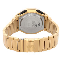 Gold-tone stainless steel case and bracelet. Fixed gold-tone stainless steel bezel. Black dial with gold-tone hands and index hour markers. Minute markers around the outer rim. Dial Type: Analog-digital. Luminescent indiglo. Quartz movement. Scratch resistant mineral crystal. Solid case back. Unique case shape, case size: 45 mm, case thickness: 15 mm. Band width: 22 mm. Fold over clasp. Water resistant at 100 meters / 330 feet. Functions: date, day, hour, minute, second, world time, alarm, chronograph, timer. Ufc Colossus Series. Sport watch style. Item Variations: TW2V84500JR. Timex UFC Colossus Alarm World Time Quartz Analog-Digital Black Dial Men's Watch TW2V84500. CASE Case Size: 45 Case Thickness: 15 mm Case Material: Stainless Steel Case Shape: Unique Case Back: Solid BAND Band Material: Stainless Steel Band Type: Bracelet Band Color: Gold-tone Band Width: 22 mm Clasp: Fold Over DIAL Dial Color: Black Type: Analog-Digital Crystal: Scratch Resistant Mineral Hands: Gold-tone Dial Markers: Index Second Markers: Minute Markers around the outer rim Luminiscence: INDIGLO Bezel: Fixed Bezel Color: Gold-tone Bezel Material: Stainless Steel INFORMATION Brand: Timex Series: Ufc Colossus Collection Name: UFC Colossus Gender: Mens Model: TW2V84500 Movement: Quartz FEATURES Water Resistance: 100 meters / 330 feet Functions: Date, Day, Hour, Minute, Second, World Time, Alarm, Chronograph, Timer Watch Features: Digital, Analog, World Time, Gold, Stainless Steel, Chronograph, Alarm ADDITIONAL INFO Watch Style: Sport Warranty: 1 Year Jomashop Warranty UPC Code: 194366277401 Jomashop Sku: TXTW2V84500 Item Variation: TW2V84500JR Department: Watches