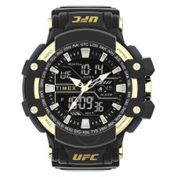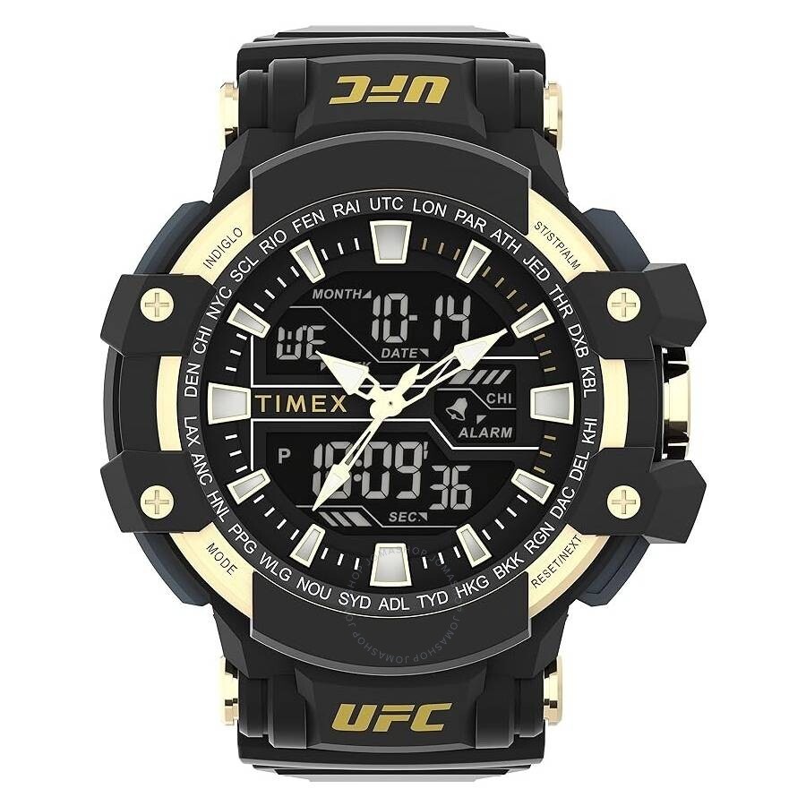 Black resin case and strap. Fixed black resin bezel. Black dial with gold-tone hands and index hour markers. Minute markers around the outer rim. Dial Type: Analog-digital. Quartz movement. Scratch resistant acrylic crystal. Pull / push crown. Solid case back. Round case shape, case size: 53 mm, case thickness: 18.5 mm. Buckle clasp. Water resistant at 50 meters / 165 feet. Functions: date, day, hour, minute, second. Ufc Combat Series. Sport watch style. Item Variations: TW5M58300. Timex UFC Combat Quartz Analog-Digital Black Dial Men's Watch TW5M58300JT. GENERAL Box Type: Original Box CASE Case Thickness: 18.5 mm Case Material: Resin Case Shape: Round Case Back: Solid BAND Band Material: Resin Band Type: Strap Band Color: Black Clasp: Buckle DIAL Dial Color: Black Type: Analog-Digital Crystal: Acrylic Hands: Gold-tone Dial Markers: Index Second Markers: Minute Markers around the outer rim Bezel: Fixed Bezel Color: Black Bezel Material: Resin Crown: Pull / Push INFORMATION Brand: Timex Series: Ufc Combat Collection Name: UFC Combat Gender: Mens Model: TW5M58300JT Movement: Quartz FEATURES Water Resistance: 50 meters / 165 feet Functions: Date, Day, Hour, Minute, Second Watch Features: Digital, Analog, Gold ADDITIONAL INFO Watch Style: Sport Warranty: 1 Year Jomashop Warranty UPC Code: 194366285796 Jomashop Sku: TXTW5M58300 Item Variation: TW5M58300 Department: Watches