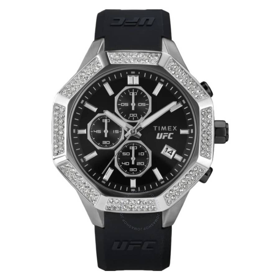 Silver-tone stainless steel case with a black silicone strap. Fixed silver-tone bezel with crystal set. Black dial with silver-tone hands and index hour markers. Minute markers around the outer rim. Dial Type: Analog. Date display at the 4 o'clock position. Chronograph - three sub-dials displaying: 60 second, 60 minute and 1/10th of a second. Quartz movement. Scratch resistant acrylic crystal. Pull / push crown. Solid case back. Octagonal case shape, case size: 45 mm, case thickness: 11 mm. Band width: 18 mm. Buckle clasp. Water resistant at 50 meters / 165 feet. Functions: chronograph, date, hour, minute, second. Ufc King Series. Sport watch style. Item Variations: TW2V99300. Timex UFC King Chronograph Quartz Crystal Black Dial Men's Watch TW2V99300JR. GENERAL Box Type: Original Box CASE Case Thickness: 11 mm Case Material: Stainless Steel Case Back: Solid BAND Band Material: Silicone Band Type: Strap Band Color: Black Band Width: 18 mm Clasp: Buckle DIAL Dial Color: Black Type: Analog Crystal: Acrylic Hands: Silver-tone Dial Markers: Index Second Markers: Minute Markers around the outer rim Sub Dials: Three - 60 Second, 60 Minute and 1/10th of a Second Bezel: Fixed Bezel Color: Silver-tone Bezel Material: Crystal Set Crown: Pull / Push INFORMATION Brand: Timex Series: Ufc King Collection Name: UFC King Gender: Mens Model: TW2V99300JR Movement: Quartz FEATURES Water Resistance: 50 meters / 165 feet Calendar: Date display at the 4 o'clock position Functions: Chronograph, Date, Hour, Minute, Second Watch Features: Chronograph, Stainless Steel, Analog ADDITIONAL INFO Watch Style: Sport Warranty: 1 Year Jomashop Warranty UPC Code: 194366333855 Jomashop Sku: TXTW2V99300 Item Variation: TW2V99300 Department: Watches