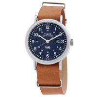 Silver-tone low lead brass case with a brown leather strap. Fixed silver-tone low lead brass bezel. Blue dial with silver-tone hands and Arabic numeral hour markers. Minute markers around the outer rim. Dial Type: Analog. Date display at the 3 o'clock position. Quartz movement. Scratch resistant mineral crystal. Pull / push crown. Solid case back. Round case shape, case size: 40 mm, case thickness: 10 mm. Band width: 20 mm. Buckle clasp. Water resistant at 50 meters / 165 feet. Functions: date, hour, minute, second, 24 hour. Weekender Series. Casual watch style. Item Variations: TW2W86800VQ. Timex Weekender Quartz Blue Dial Watch TW2W86800. GENERAL Box Type: Original Box CASE Case Diameter: 40 mm Case Thickness: 10 mm Case Material: Low Lead Brass Case Shape: Round Case Back: Solid BAND Band Material: Leather Band Type: Strap Band Color: Brown Band Width: 20 mm Clasp: Buckle DIAL Dial Color: Blue Type: Analog Crystal: Scratch Resistant Mineral Hands: Silver-tone Dial Markers: Arabic Numeral Second Markers: Minute Markers around the outer rim Bezel: Fixed Bezel Color: Silver-tone Bezel Material: Low Lead Brass Crown: Pull / Push INFORMATION Brand: Timex Series: Weekender Collection Name: Weekender Gender: Mens Model: TW2W86800 Movement: Quartz FEATURES Water Resistance: 50 meters / 165 feet Calendar: Date display at the 3 o'clock position Functions: Date, Hour, Minute, Second, 24 Hour Watch Features: Leather, Analog ADDITIONAL INFO Watch Style: Casual Warranty: 1 Year Jomashop Warranty UPC Code: 194366378627 Jomashop Sku: TXTW2W86800 Item Variation: TW2W86800VQ Department: Watches