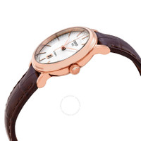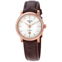 Rose gold PVD stainless steel case with a brown leather strap. Fixed rose gold PVD bezel. Silver dial with rose gold-tone leaf-style hands and index hour markers. Minute markers around the outer rim. Dial Type: Analog. Date display above the 6 o'clock position. ETA caliber 2671 automatic movement, containing 25 Jewels, bitting at 28800 vph, and has a power reserve of approximately 38 hours. Scratch resistant sapphire crystal. Transparent case back. Round case shape. Case size: 30 mm. Case thickness: 9.48 mm. Band width: 15 mm. Butterfly clasp. Water resistant at 50 meters / 165 feet. Functions: date, hour, minute, second. Casual watch style. Watch label: Swiss Made. Tissot Carson Automatic Silver Dial Ladies Watch T122.207.36.031.00. INFORMATION Brand: Tissot Series: Carson Collection Name: Carson Gender: Womens Model: T122.207.36.031.00 Watch Label: Swiss Made Movement: Automatic Engine: ETA Caliber 2671 Power Reserve: 38 hours CASE Case Size: 30 mm Case Thickness: 9.48 mm Case Material: Stainless Steel Case Shape: Round Case Back: Transparent BAND Band Material: Leather Band Type: Strap Band Color: Brown Band Width: 15 mm Clasp: Butterfly DIAL Dial Color: Silver Type: Analog Crystal: Scratch Resistant Sapphire Hands: Rose Gold-tone Leaf-style Dial Markers: Index Second Markers: Minute Markers around the outer rim Bezel: Fixed Bezel Color: Rose Gold PVD Bezel Material: Stainless Steel FEATURES Water Resistance: 50 meters / 165 feet Calendar: Date display above the 6 o'clock position Functions: Date, Hour, Minute, Second Watch Features: Stainless Steel, Leather, Gold, Analog ADDITIONAL INFO Watch Style: Casual Warranty: 2 Year Jomashop Warranty UPC Code: 7611608287521 Jomashop Sku: TIST1222073603100 Department: Watches Category: Watches