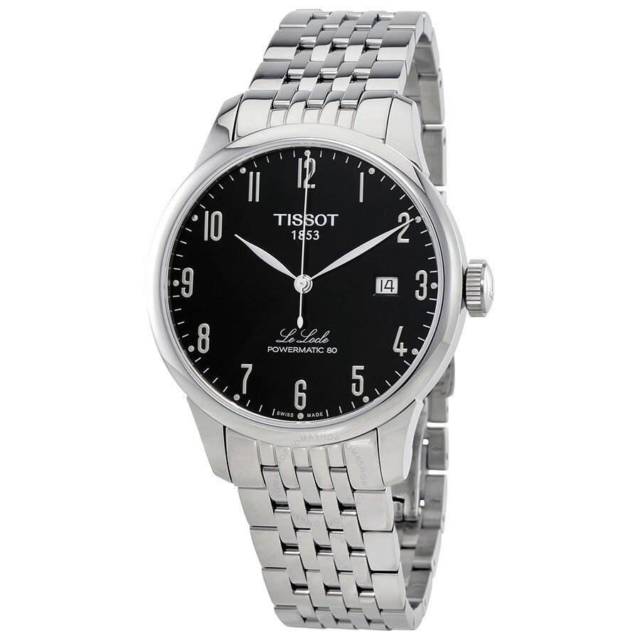 Stainless steel case with a stainless steel bracelet. Fixed stainless steel bezel. Black dial with luminous silver-tone leaf-style hands and Arabic numeral hour markers. Minute markers around the outer rim. Dial Type: Analog. Date display at the 3 o'clock position. Powermatic 80.111 automatic movement, containing 23 Jewels, bitting at 28800 vph, and has a power reserve of approximately 80 hours. Scratch resistant sapphire crystal. Pull / push crown. Transparent case back. Round case shape. Case size: 39.3 mm. Case thickness: 9.75 mm. Band width: 19 mm. Band length: 8.5 inches. Fold over clasp with push button release. Water resistant at 30 meters / 100 feet. Functions: date, hour, minute, second. Dress watch style. Watch label: Swiss Made. Tissot Le Locle Automatic Black Dial Men's Watch T006.407.11.052.00. GENERAL Box Type: Original Box CASE Case Diameter: 39 mm Case Thickness: 9.75 mm Case Material: Stainless Steel Case Shape: Round Case Back: Transparent BAND Band Material: Stainless Steel Band Type: Bracelet Band Color: Silver-tone Band Length: 8.5 inches Band Width: 19 mm Clasp: Deployment with Push Button Release DIAL Dial Color: Black Type: Analog Crystal: Scratch Resistant Sapphire Hands: Luminous Silver-tone Leaf-style Dial Markers: Arabic Numeral Second Markers: Minute Markers around the outer rim Bezel: Fixed Bezel Color: Silver-tone Bezel Material: Stainless Steel Crown: Pull / Push INFORMATION Brand: Tissot Series: Le Locle Collection Name: Le Locle Gender: Mens Model: T006.407.11.052.00 Watch Label: Swiss Made Movement: Automatic Engine: Powermatic 80.111 Power Reserve: 80 hours FEATURES Water Resistance: 30 meters / 100 feet Calendar: Date display at the 3 o'clock position Functions: Date, Hour, Minute, Second Watch Features: Analog, Stainless Steel ADDITIONAL INFO Watch Style: Dress Warranty: 2 Year Jomashop Warranty UPC Code: 7611608276983 Jomashop Sku: TIST0064071105200 Department: Watches Category: Watches