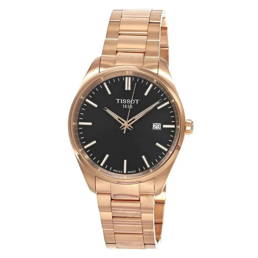 Rose gold PVD stainless steel case and bracelet. Fixed rose gold PVD stainless steel bezel. Black dial with rose gold-tone hands and index hour markers. Minute markers around the outer rim. Dial Type: Analog. Luminescent hands and markers. Date display at the 3 o'clock position. Renata 371 quartz movement. Scratch resistant sapphire crystal. Pull / push crown. Solid case back. Round case shape, case size: 40 mm, case thickness: 8.25 mm. Band width: 20 mm. Butterfly clasp. Water resistant at 100 meters / 330 feet. Functions: date, hour, minute, second. Pr 100 Series. Casual watch style. Watch label: Swiss Made. Tissot PR 100 Quartz Black Dial Men's Watch T1504103305100. GENERAL Box Type: Original Box CASE Case Thickness: 8.25 mm Case Material: Stainless Steel Case Shape: Round Case Back: Solid BAND Band Material: Stainless Steel Band Type: Bracelet Band Color: Rose Gold PVD Band Width: 20 mm Clasp: Butterfly DIAL Dial Color: Black Type: Analog Crystal: Scratch Resistant Sapphire Hands: Rose Gold-tone Dial Markers: Index Second Markers: Minute Markers around the outer rim Luminiscence: Hands and Markers Bezel: Fixed Bezel Color: Rose Gold PVD Bezel Material: Stainless Steel Crown: Pull / Push INFORMATION Brand: Tissot Series: Pr 100 Collection Name: PR 100 Gender: Mens Model: T1504103305100 Watch Label: Swiss Made Movement: Quartz Engine: Renata 371 FEATURES Water Resistance: 100 meters / 330 feet Calendar: Date display at the 3 o'clock position Functions: Date, Hour, Minute, Second Watch Features: Analog, Gold, Stainless Steel ADDITIONAL INFO Watch Style: Casual Warranty: 2 Year Jomashop Warranty UPC Code: 7611608327852 Jomashop Sku: TIST1504103305100 Department: Watches