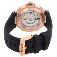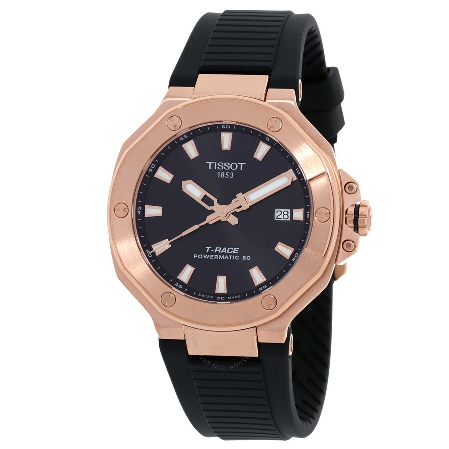 Rose gold PVD stainless steel case with a black silicone strap. Fixed rose gold PVD stainless steel bezel. Black dial with rose gold-tone hands and index hour markers. Minute markers around the outer rim. Dial Type: Analog. Luminescent hands and markers. Date display at the 3 o'clock position. Automatic movement with an 80-hour power reserve. Scratch resistant sapphire crystal. Transparent see through case back. Round case shape, case size: 41 mm, case thickness: 11.28 mm. Band width: 12.95 mm. Buckle clasp. Water resistant at 100 meters / 330 feet. Functions: date, hour, minute, second. T-race Series. Sport watch style. Watch label: Swiss Made. Tissot T-Race Powermatic 80 Automatic Black Dial Men's Watch T1418073705100. GENERAL Box Type: Original Box CASE Case Thickness: 11.28 mm Case Material: Stainless Steel Case Shape: Round Case Back: Transparent See Through BAND Band Material: Silicone Band Type: Strap Band Color: Black Band Width: 12.95 mm Clasp: Buckle DIAL Dial Color: Black Type: Analog Crystal: Scratch Resistant Sapphire Hands: Rose Gold-tone Dial Markers: Index Second Markers: Minute Markers around the outer rim Luminiscence: Hands and Markers Bezel: Fixed Bezel Color: Rose Gold PVD Bezel Material: Stainless Steel INFORMATION Brand: Tissot Series: T-Race Collection Name: T-Race Gender: Mens Model: T1418073705100 Watch Label: Swiss Made Movement: Automatic Power Reserve: 80 hours FEATURES Water Resistance: 100 meters / 330 feet Calendar: Date display at the 3 o'clock position Functions: Date, Hour, Minute, Second Watch Features: Analog, Gold, Stainless Steel ADDITIONAL INFO Watch Style: Sport Warranty: 2 Year Jomashop Warranty UPC Code: 7611608315910 Jomashop Sku: TIST1418073705100 Department: Watches