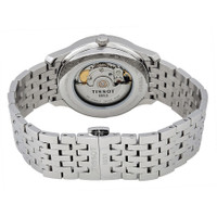 Stainless steel case with a stainless steel bracelet. Fixed stainless steel bezel. Black dial with silver-tone hands and index hour markers. A Roman numeral appears at the 12 o'clock position. Minute markers around the outer rim. Dial Type: Analog. Date display at the 3 o'clock position. Small seconds sub-dial. ETA caliber 2825-2 automatic movement with a 38-hour power reserve. Scratch resistant sapphire crystal. Transparent case back. Case size: 40 mm. Case thickness: 11.2 mm. Round case shape. Band width: 20 mm. Fold over deployment clasp. Water resistant at 30 meters / 100 feet. Functions: date, hour, minute, second. Dress watch style. Watch label: Swiss Made. Tissot Tradition Automatic Black Dial Men's Watch T063.428.11.058.00 GENERAL Box Type: Original Box CASE Case Diameter: 40 mm Case Thickness: 11.2 mm Case Material: Stainless Steel Case Shape: Round Case Back: Transparent BAND Band Material: Stainless Steel Band Type: Bracelet Band Color: Silver-tone Band Width: 20 mm Clasp: Fold Over Deployment DIAL Dial Color: Black Type: Analog Crystal: Scratch Resistant Sapphire Hands: Silver-tone Dial Markers: Index Second Markers: Roman Numeral appears at the 12 o'clock position. Minute Markers around the outer rim Sub Dials: One - Small Second Bezel: Fixed Bezel Color: Silver-tone Bezel Material: Stainless Steel INFORMATION Brand: Tissot Series: Tradition Collection Name: Tradition Gender: Mens Model: T063.428.11.058.00 Watch Label: Swiss Made Movement: Automatic Engine: ETA Caliber 2825-2 Power Reserve: 38 hours FEATURES Water Resistance: 30 meters / 100 feet Calendar: Date display at the 3 o'clock position Functions: Date, Hour, Minute, Second Watch Features: Analog, Stainless Steel ADDITIONAL INFO Watch Style: Dress Warranty: 2 Year Jomashop Warranty UPC Code: 7611608280249 Jomashop Sku: TIST0634281105800 Department: Watches Category: Watches