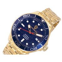 Torino Carrero Men's Avatar Automatic NH35 - 24 JEWELS, Blue Date Dial, Gold tone. Yellow gold-tone stainless steel case and bracelet. Uni-directional rotating blue stainless steel bezel. Blue dial with yellow gold-tone hands and Arabic numeral & index hour markers. Minute markers around the outer rim. Dial Type: Analog. Luminescent hands and markers. Date display at the 3 o'clock position. TMI Caliber NH35 Automatic movement, containing 24 Jewels, bitting at 21600 vph, and has a power reserve of approximately 41 hours. Scratch resistant mineral crystal. Screw down crown. Solid case back. Round case shape, case size: 44.5 mm, case thickness: 15 mm. Band width: 22 mm, band length: 7.25 inches. Deployment with push button release clasp. Water resistant at 100 meters / 330 feet. Functions: date, hour, minute, second. Avatar Series. Casual watch style. Watch label: Japan Movt. Torino Carrero Avatar Automatic Blue Dial Men's Watch C1G6161BUJ. CASE Case Diameter: 44 Case Thickness: 15 mm Case Material: Stainless Steel Case Shape: Round Case Back: Solid BAND Band Material: Stainless Steel Band Type: Bracelet Band Color: Yellow Gold-tone Band Length: 7.25 inches Band Width: 22 mm Clasp: Deployment with Push Button Release DIAL Dial Color: Blue Type: Analog Crystal: Scratch Resistant Mineral Hands: Yellow Gold-tone Dial Markers: Arabic Numeral & Index Second Markers: Minute Markers around the outer rim Luminiscence: Hands and Markers Bezel: Uni-directional Rotating Bezel Color: Blue Bezel Material: Stainless Steel Crown: Screw Down INFORMATION Brand: Torino Carrero Series: Avatar Collection Name: Avatar Gender: Mens Model: C1G6161BUJ Watch Label: Japan Movt Movement: Automatic Engine: TMI Caliber NH35 Power Reserve: 41 hours FEATURES Water Resistance: 100 meters / 330 feet Calendar: Date Display at the 3 o'clock position Functions: Date, Hour, Minute, Second Watch Features: Stainless Steel, Gold, Analog ADDITIONAL INFO Watch Style: Casual Warranty: With Manufacturers Guarantee Jomashop Sku: Y-A4K7U Department: Watches