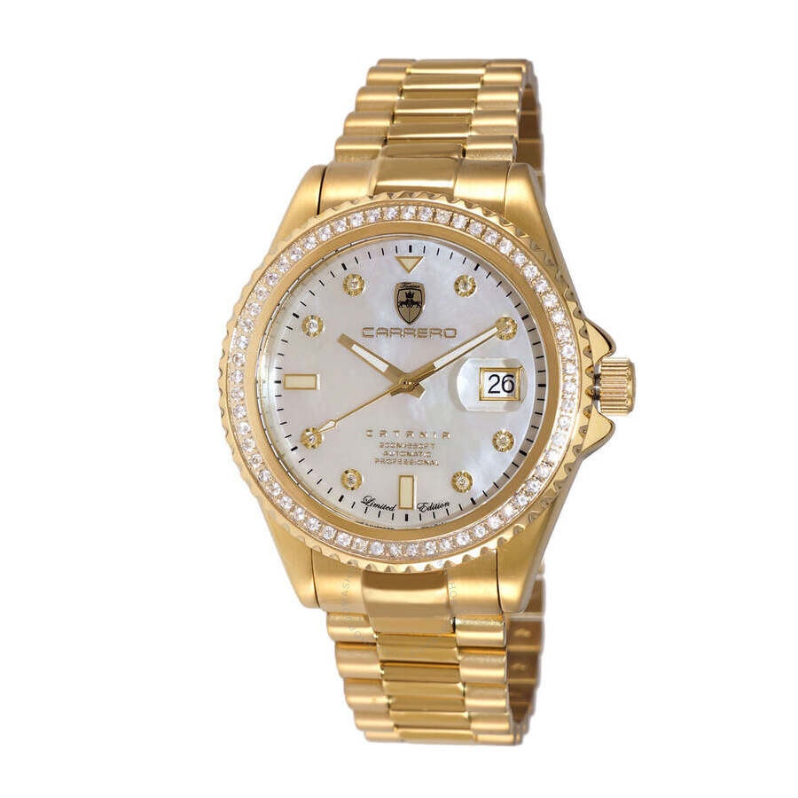 Torino Carrero Men's Catania Sapphire Automatic NH35 - 24 JEWELS,w/ Guniune Sapphire Gem Stone (69 pcs) Mother of Pearl White Dial, Gold tone. Yellow gold-tone stainless steel case and bracelet. Uni-directional rotating yellow gold-tone stainless steel bezel. Black dial with yellow gold-tone hands and index hour markers. Minute markers around the outer rim. Dial Type: Analog. Luminescent hands and markers. Date display at the 3 o'clock position. TMI Caliber NH35 Automatic movement, containing 24 Jewels, bitting at 21600 vph, and has a power reserve of approximately 41 hours. Scratch resistant mineral crystal. Screw down crown. Transparent case back. Round case shape, case size: 44 mm, case thickness: 15 mm. Band width: 20 mm, band length: 8.25 inches. Deployment with push button release clasp. Water resistant at 200 meters / 660 feet. Functions: date, hour, minute, second. Catania Series. Casual watch style. Watch label: Japan Movt. Torino Carrero Catania Automatic Black Dial Men's Watch C1G787WTJ. CASE Case Diameter: 44 Case Thickness: 15 mm Case Material: Stainless Steel Case Shape: Round Case Back: Transparent BAND Band Material: Stainless Steel Band Type: Bracelet Band Color: Yellow Gold-tone Band Length: 8.25 inches Band Width: 20 mm Clasp: Deployment with Push Button Release DIAL Dial Color: Black Type: Analog Crystal: Scratch Resistant Mineral Hands: Yellow Gold-tone Dial Markers: Index Second Markers: Minute Markers around the outer rim Luminiscence: Hands and Markers Bezel: Uni-directional Rotating Bezel Color: Yellow Gold-tone Bezel Material: Stainless Steel Crown: Screw Down INFORMATION Brand: Torino Carrero Series: Catania Collection Name: Catania Gender: Mens Model: C1G787WTJ Watch Label: Japan Movt Movement: Automatic Engine: TMI Caliber NH35 Power Reserve: 41 hours FEATURES Water Resistance: 200 meters / 660 feet Calendar: Date Display at the 3 o'clock position Functions: Date, Hour, Minute, Second Watch Features: Stainless Steel, Gold, Analog ADDITIONAL INFO Watch Style: Casual Warranty: With Manufacturers Guarantee Jomashop Sku: Y-A4KE3 Department: Watches
