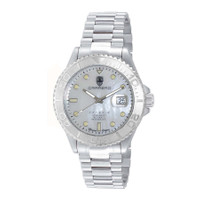 Torino Carrero Men's Avatar Automatic NH35 - 21 JEWELS, Mother of Pearl White DateDial, Silver tone. Silver-tone stainless steel case and bracelet. Uni-directional rotating white stainless steel bezel. White dial with silver-tone hands and index hour markers. Minute markers around the outer rim. Dial Type: Analog. Luminescent hands and markers. Date display at the 3 o'clock position. TMI Caliber NH35 Automatic movement, containing 24 Jewels, bitting at 21600 vph, and has a power reserve of approximately 41 hours. Scratch resistant mineral crystal. Screw down crown. Transparent case back. Round case shape, case size: 44 mm, case thickness: 15 mm. Band width: 21.5 mm, band length: 8.25 inches. Deployment with push button release clasp. Water resistant at 100 meters / 330 feet. Functions: date, hour, minute, second. Catania Series. Casual watch style. Watch label: Japan Movt. Torino Carrero Catania Automatic White Dial Men's Watch C1S266WTJ. GENERAL Box Type: Original Box CASE Case Diameter: 44 Case Thickness: 15 mm Case Material: Stainless Steel Case Shape: Round Case Back: Transparent BAND Band Material: Stainless Steel Band Type: Bracelet Band Color: Silver-tone Band Length: 8.25 inches Band Width: 21.5 mm Clasp: Deployment with Push Button Release DIAL Dial Color: White Type: Analog Crystal: Scratch Resistant Mineral Hands: Silver-tone Dial Markers: Index Second Markers: Minute Markers around the outer rim Luminiscence: Hands and Markers Bezel: Uni-directional Rotating Bezel Color: White Bezel Material: Stainless Steel Crown: Screw Down INFORMATION Brand: Torino Carrero Series: Catania Collection Name: Catania Gender: Mens Model: C1S266WTJ Watch Label: Japan Movt Movement: Automatic Engine: TMI Caliber NH35 Power Reserve: 41 hours FEATURES Water Resistance: 100 meters / 330 feet Calendar: Date Display at the 3 o'clock position Functions: Date, Hour, Minute, Second Watch Features: Stainless Steel, Analog ADDITIONAL INFO Watch Style: Casual Warranty: With Manufacturers Guarantee Jomashop Sku: Y-A4KEE Department: Watches