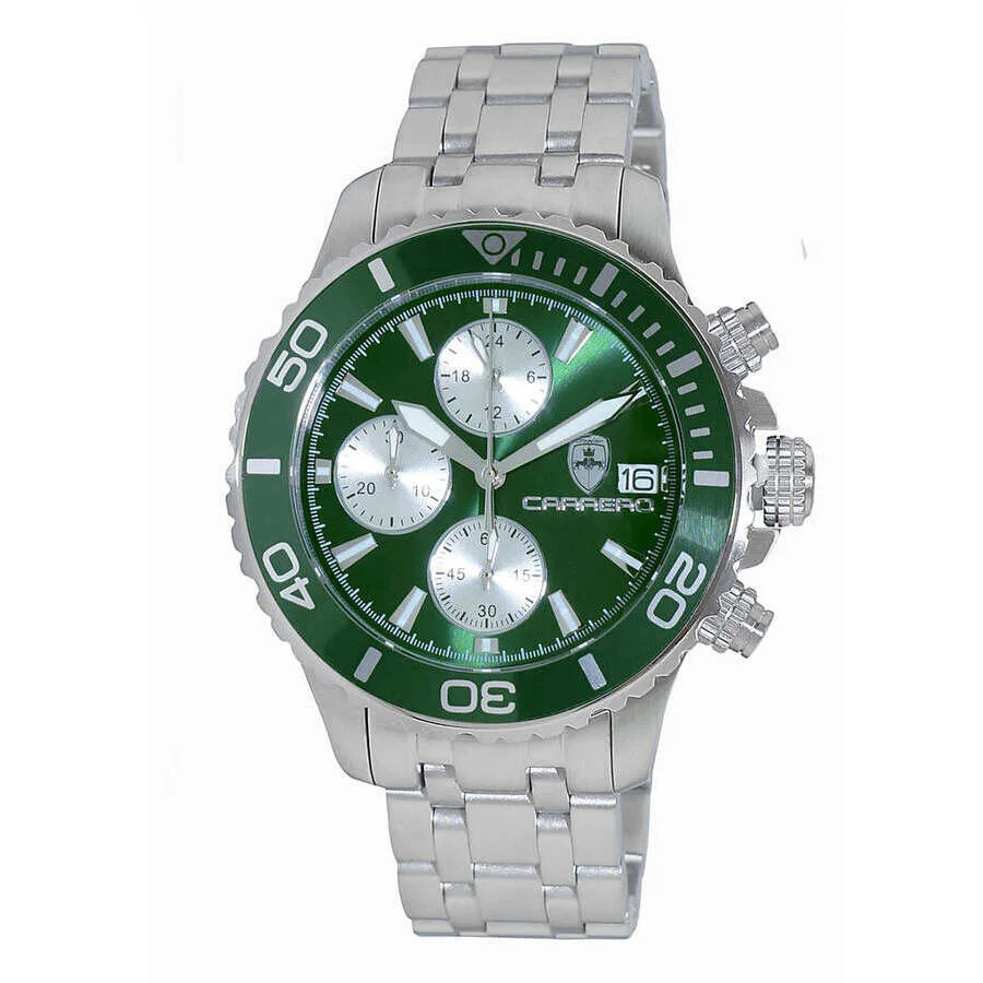 Torino Carrero Men's TIME BOLD - CX2 , VR33 - Chronograph Movement, Green Date - Dial GENERAL Box Type: Original Box CASE Case Thickness: 15 mm Case Material: Stainless Steel Case Shape: Round Case Back: Solid BAND Band Material: Stainless Steel Band Type: Bracelet Band Color: Silver-tone Band Length: 7.25 inches Band Width: 20 mm Clasp: Deployment with Push Button Release DIAL Dial Color: Green Type: Analog Crystal: Scratch Resistant Mineral Dial Markers: Index Second Markers: Minute Scale around the inner rim Sub Dials: 60 Minute Luminiscence: Hands and Markers Bezel: Uni-directional Rotating Bezel Color: Green Bezel Material: Stainless Steel Crown: Pull / Push INFORMATION Brand: Torino Carrero Series: Time Bold - Cx2 Collection Name: Time Bold - Cx2 Gender: Mens Model: C1S3735GN Watch Label: Quartz, Japan Movement Movement: Quartz Engine: VR33 - Japan FEATURES Water Resistance: 100 meters / 330 feet Calendar: Date Display at the 3 o'clock position Functions: Calendar, Chronograph Watch Features: Chronograph, Analog ADDITIONAL INFO Watch Style: Casual Warranty: With Manufacturers Guarantee Jomashop Sku: Y-A5VZZ Department: Watches