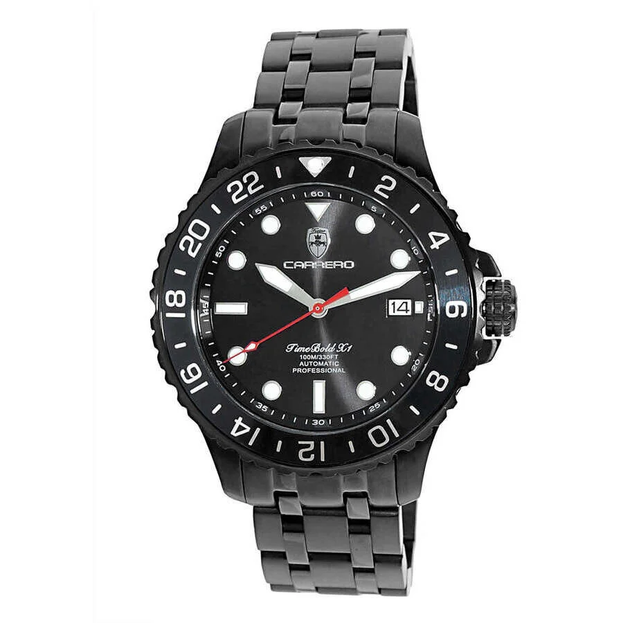 TORINO CARRERO, TIME BOLD- X1 COLLECTION, NH35 AUTOMATIC MOVEMENT, 10 ATM, IPB - BLACK GENERAL Box Type: Original Box CASE Case Thickness: 14 mm Case Material: Stainless Steel Case Shape: Round Case Back: Solid BAND Band Material: Stainless Steel Band Type: Bracelet Band Color: Silver-tone Band Length: 7.25 inches Band Width: 20 mm Clasp: Deployment with Push Button Release DIAL Dial Color: Black Type: Analog Crystal: Scratch Resistant Mineral Dial Markers: Index Second Markers: Minute Scale around the inner rim Luminiscence: Hands and Markers Bezel: Uni-directional Rotating Bezel Color: Black Bezel Material: Aluminum Crown: Pull / Push INFORMATION Brand: Torino Carrero Series: Time Bold - X1 Collection Name: Time Bold - X1 Gender: Mens Model: C1B737BK-BK Watch Label: Automatic Movement, Japan Made Movement: Automatic Engine: Automatic NH35 - 24 JEWELS FEATURES Water Resistance: 100 meters / 330 feet Calendar: Date Display at the 3 o'clock position Functions: Calendar Watch Features: Analog ADDITIONAL INFO Watch Style: Casual Warranty: With Manufacturers Guarantee Jomashop Sku: Y-A5VZG Department: Watches