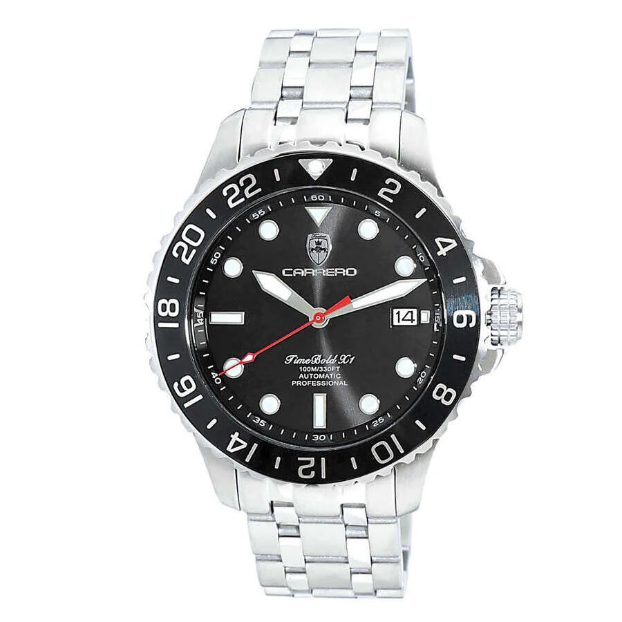 TORINO CARRERO, TIME BOLD- X1 COLLECTION, NH35 AUTOMATIC MOVEMENT, 10 ATM, SILVERTONE - BLACK/BLACK GENERAL Box Type: Original Box CASE Case Thickness: 14 mm Case Material: Stainless Steel Case Shape: Round Case Back: Solid BAND Band Material: Stainless Steel Band Type: Bracelet Band Color: Silver-tone Band Length: 7.25 inches Band Width: 20 mm Clasp: Deployment with Push Button Release DIAL Dial Color: Black Type: Analog Crystal: Scratch Resistant Mineral Dial Markers: Index Second Markers: Minute Scale around the inner rim Luminiscence: Hands and Markers Bezel: Uni-directional Rotating Bezel Color: Black Bezel Material: Aluminum Crown: Pull / Push INFORMATION Brand: Torino Carrero Series: Time Bold - X1 Collection Name: Time Bold - X1 Gender: Mens Model: C1S737BK-BK Watch Label: Automatic Movement, Japan Made Movement: Automatic Engine: Automatic NH35 - 24 JEWELS FEATURES Water Resistance: 100 meters / 330 feet Calendar: Date Display at the 3 o'clock position Functions: Calendar Watch Features: Analog ADDITIONAL INFO Watch Style: Casual Warranty: With Manufacturers Guarantee Jomashop Sku: Y-A5W26 Department: Watches