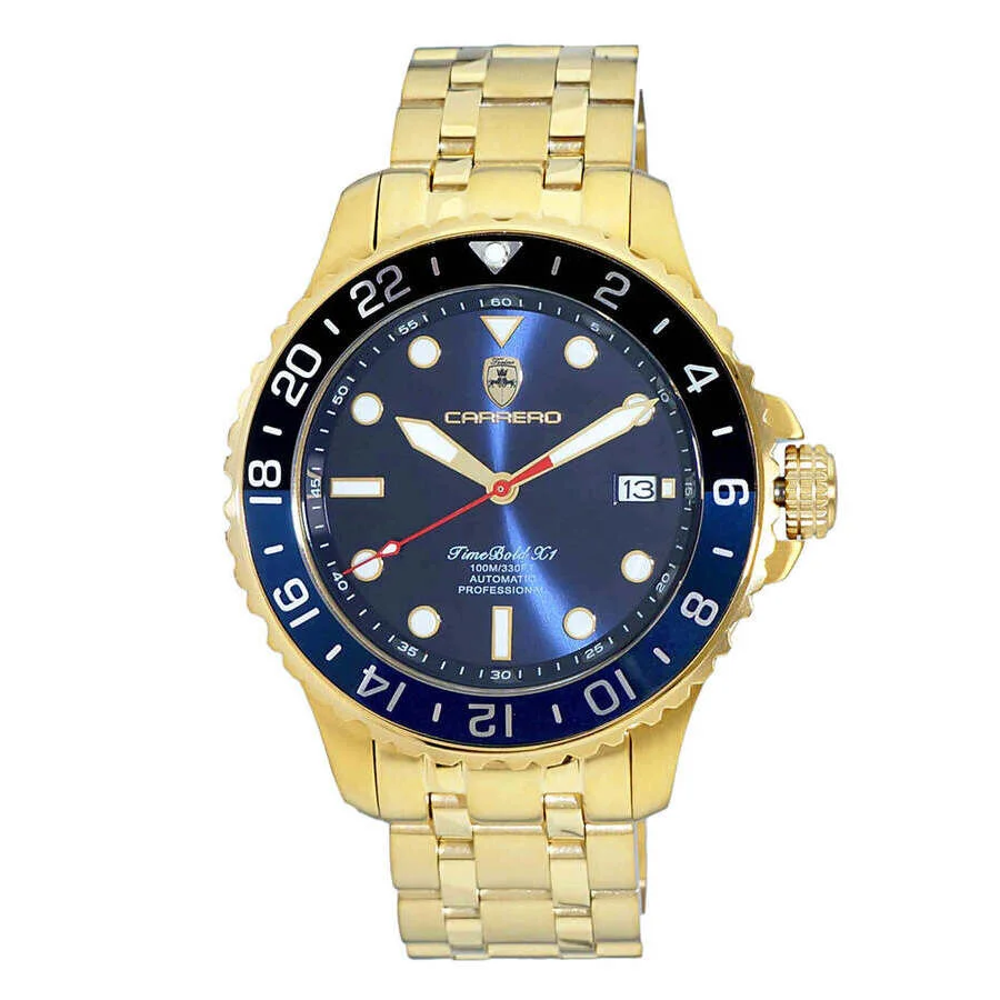 TORINO CARRERO, TIME BOLD- X1 COLLECTION, NH35 AUTOMATIC MOVEMENT, 10 ATM, IP-Gold - BLUE GENERAL Box Type: Original Box CASE Case Thickness: 14 mm Case Material: Stainless Steel Case Shape: Round Case Back: Solid BAND Band Material: Stainless Steel Band Type: Bracelet Band Color: Silver-tone Band Length: 7.25 inches Band Width: 20 mm Clasp: Deployment with Push Button Release DIAL Dial Color: Blue Type: Analog Crystal: Scratch Resistant Mineral Dial Markers: Index Second Markers: Minute Scale around the inner rim Luminiscence: Hands and Markers Bezel: Uni-directional Rotating Bezel Color: Multi-Color Bezel Material: Aluminum Crown: Pull / Push INFORMATION Brand: Torino Carrero Series: Time Bold - X1 Collection Name: Time Bold - X1 Gender: Mens Model: C1G737BU-BK Watch Label: Automatic Movement, Japan Made Movement: Automatic Engine: Automatic NH35 - 24 JEWELS FEATURES Water Resistance: 100 meters / 330 feet Calendar: Date Display at the 3 o'clock position Functions: Calendar Watch Features: Gold, Analog ADDITIONAL INFO Watch Style: Casual Warranty: With Manufacturers Guarantee Jomashop Sku: Y-A5VZJ Department: Watches