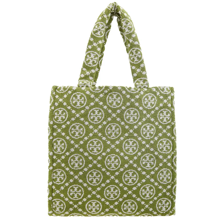 Tory Burch Ladies Tote. SKU: 148687-307. Color: Leaf Green. Tory Burch T Monogram Terry Tote Bag. Inspired by traditional Pennsylvania Dutch quilting, the T Monogram pattern embodies timeless style, while the new terry tote, crafted from thick, soft brushed cotton and woven on jacquard looms, offers an interior zip pocket and ample space for all of your daily essentials. 100% Cotton. GENERAL Size Info: H15.4" x L14.6" x D3.9" Brand Type: Designer Color: Leaf Green INFORMATION Brand: Tory Burch Gender: Womens Model: 148687-307 DETAILS Material: Cotton Closure: Open ADDITIONAL INFO UPC Code: 196133726297 Jomashop Sku: Z-PX9TW Department: Bags Category: Tote Bags