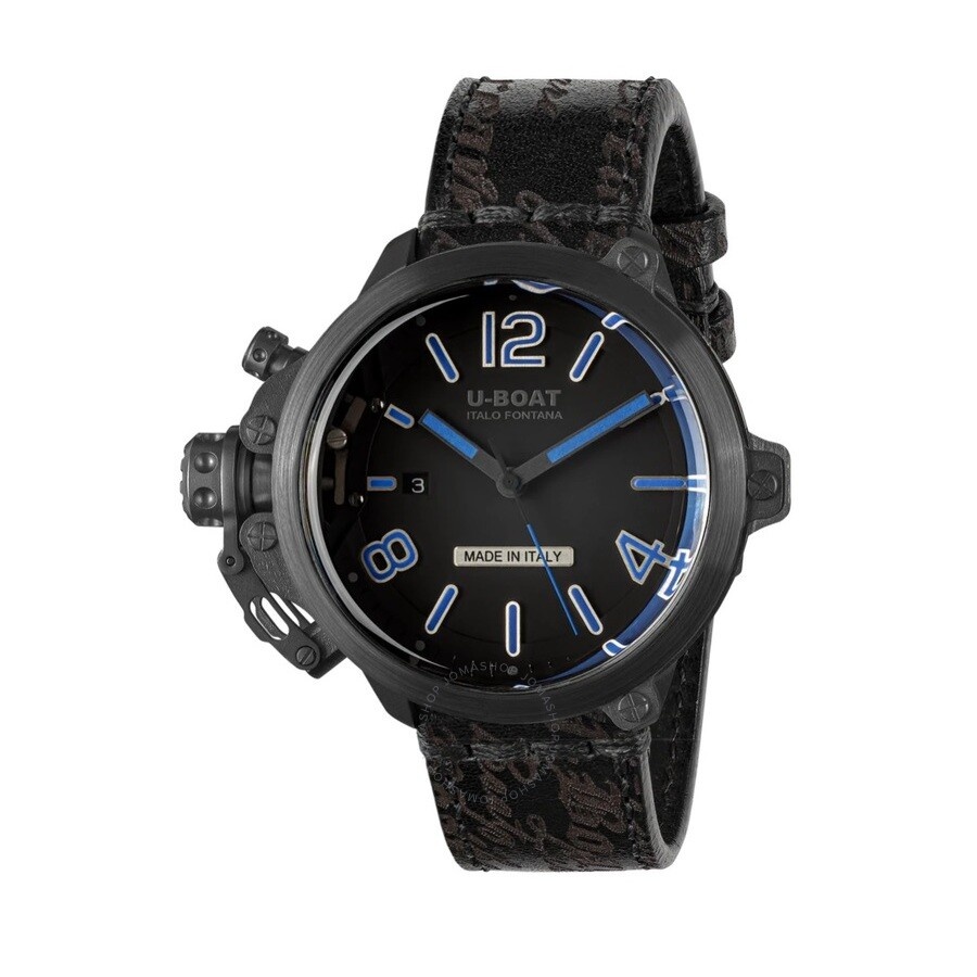 Black stainless steel case with a black leather strap. Fixed black stainless steel bezel. Black dial with black hands and Arabic numeral & index hour markers. Dial Type: Analog. Luminescent hands and markers. Date display at the 9 o'clock position. Sellita Caliber SW 200 Automatic movement, based upon ETA 2824-2, containing 26 Jewels, bitting at 28800 vph, and has a power reserve of approximately 38 hours. Scratch resistant sapphire crystal. Screw down crown. Solid case back. Round case shape, case size: 45 mm. Buckle clasp. Functions: date, hour, minute, second. Capsule Series. Casual watch style. U-Boat Capsule Automatic Black Dial Men's Watch 8808. GENERAL Box Type: Original Box CASE Case Size: 45 Case Material: Stainless Steel Case Shape: Round Case Back: Solid BAND Band Material: Leather Band Type: Strap Band Color: Black Clasp: Buckle DIAL Dial Color: Black Type: Analog Crystal: Scratch Resistant Sapphire Hands: Black Dial Markers: Arabic Numeral & Index Luminiscence: Hands and Markers Bezel: Fixed Bezel Color: Black Bezel Material: Stainless Steel Crown: Screw Down INFORMATION Brand: U-Boat Series: Capsule Collection Name: Capsule Gender: Mens Model: 8808 Movement: Automatic Engine: Sellita Caliber SW 200 Power Reserve: 38 hours FEATURES Calendar: Date display at the 9 o'clock position Functions: Date, Hour, Minute, Second Watch Features: Analog, Leather, Stainless Steel ADDITIONAL INFO Watch Style: Casual Warranty: 2 Year Jomashop Warranty Jomashop Sku: UB8808 Department: Watches